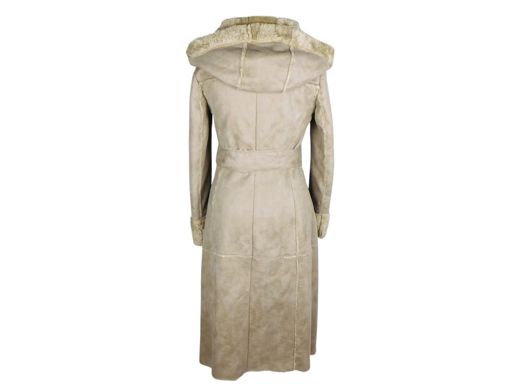 Dámský béžový dlouhý zimní kabát s páskem a kapucí Promod S