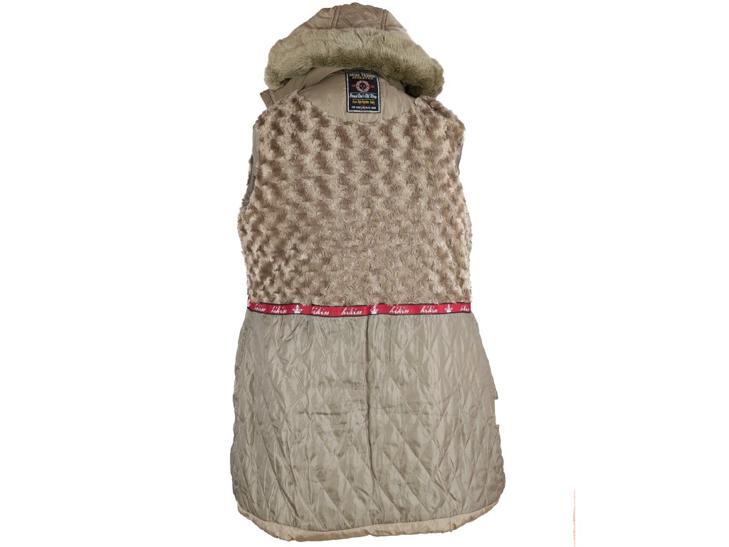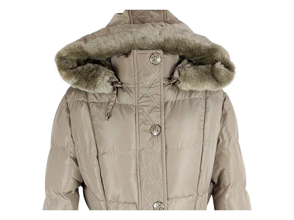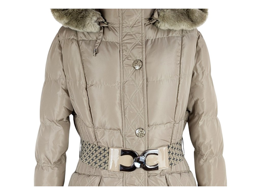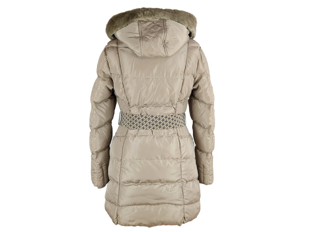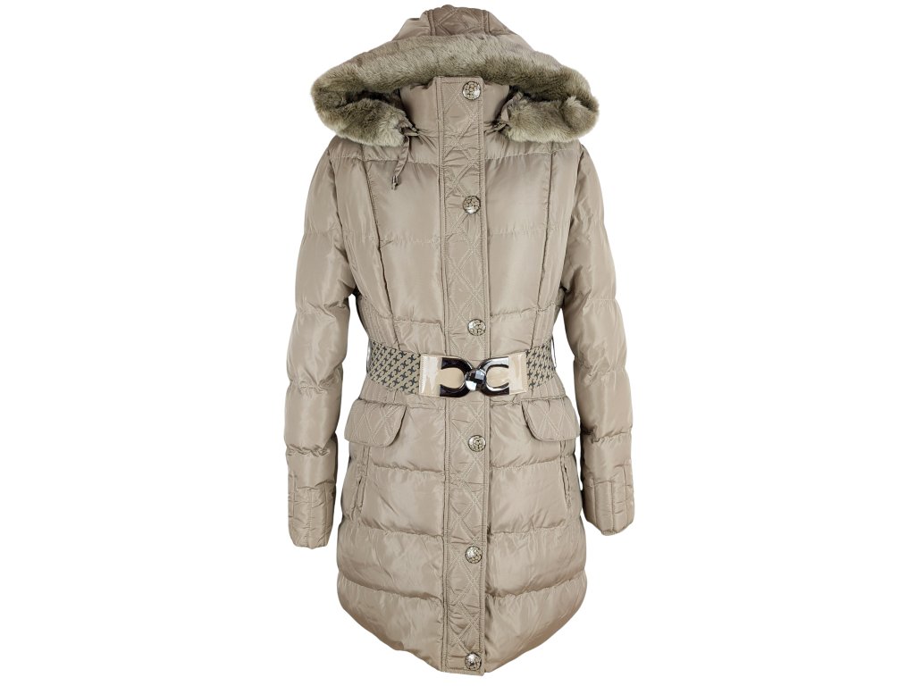 Dámský béžový prošívaný zimní kabát s páskem a kapucí Hikiss M