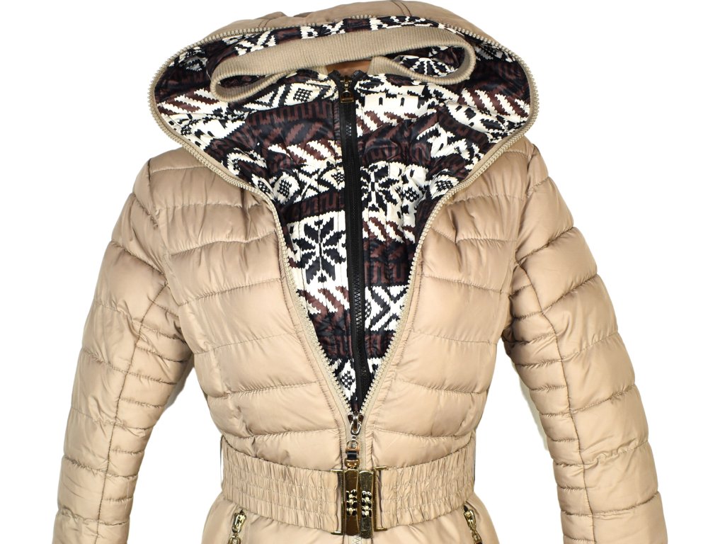 Dámský béžový zimní prošívaný kabát s páskem a kapucí Tom Fashion S