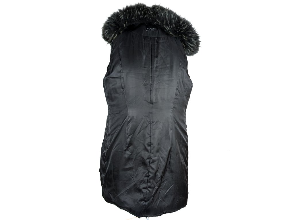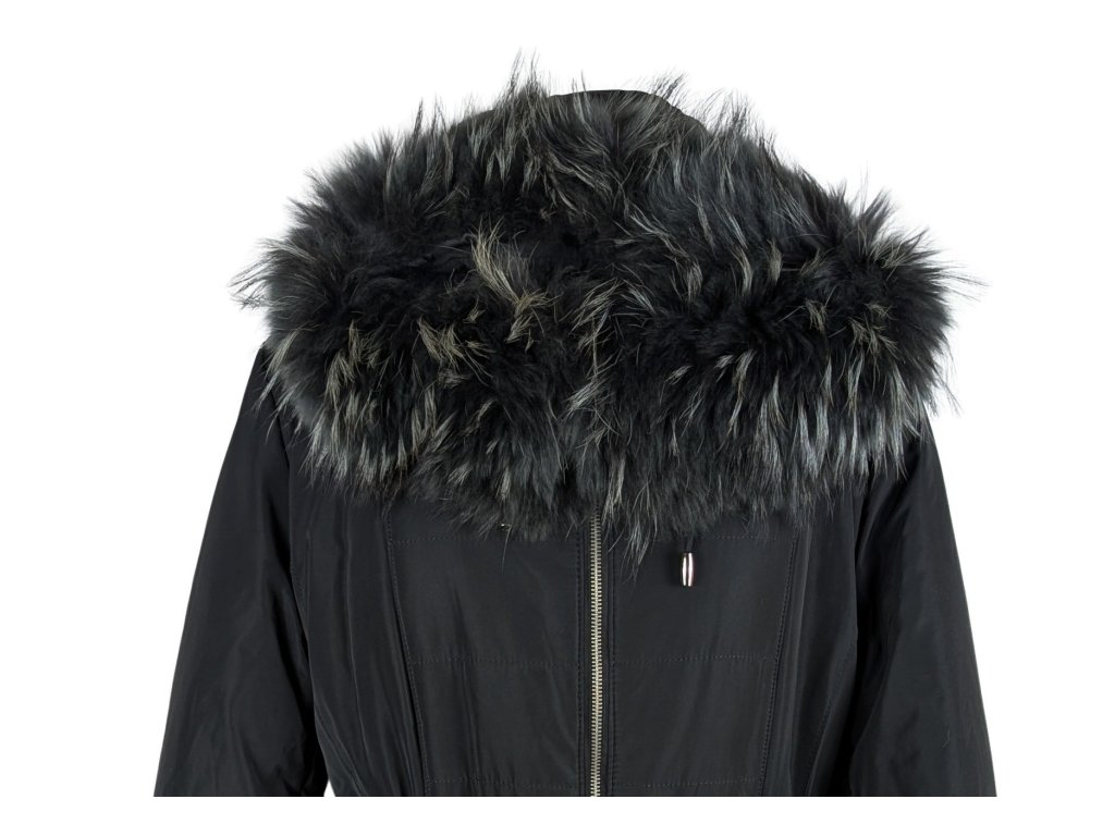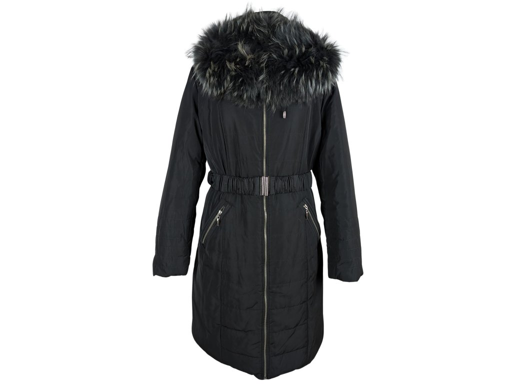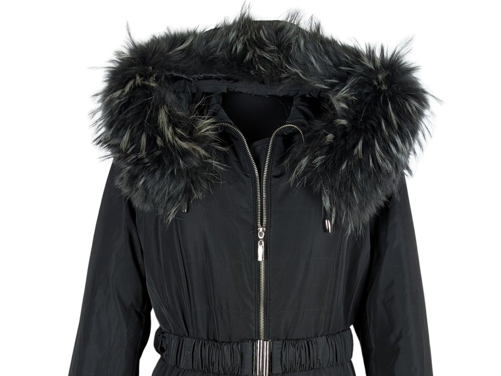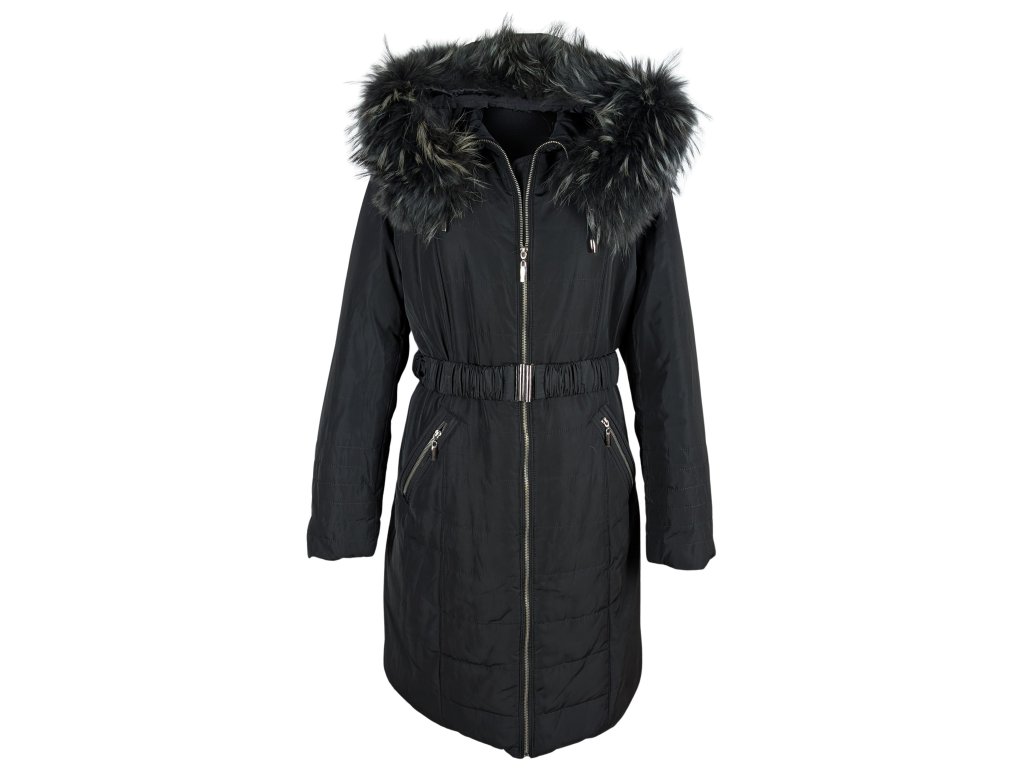 Dámský černý dlouhý prošívaný kabát s páskem a kapucí s pravou kožešinou 46