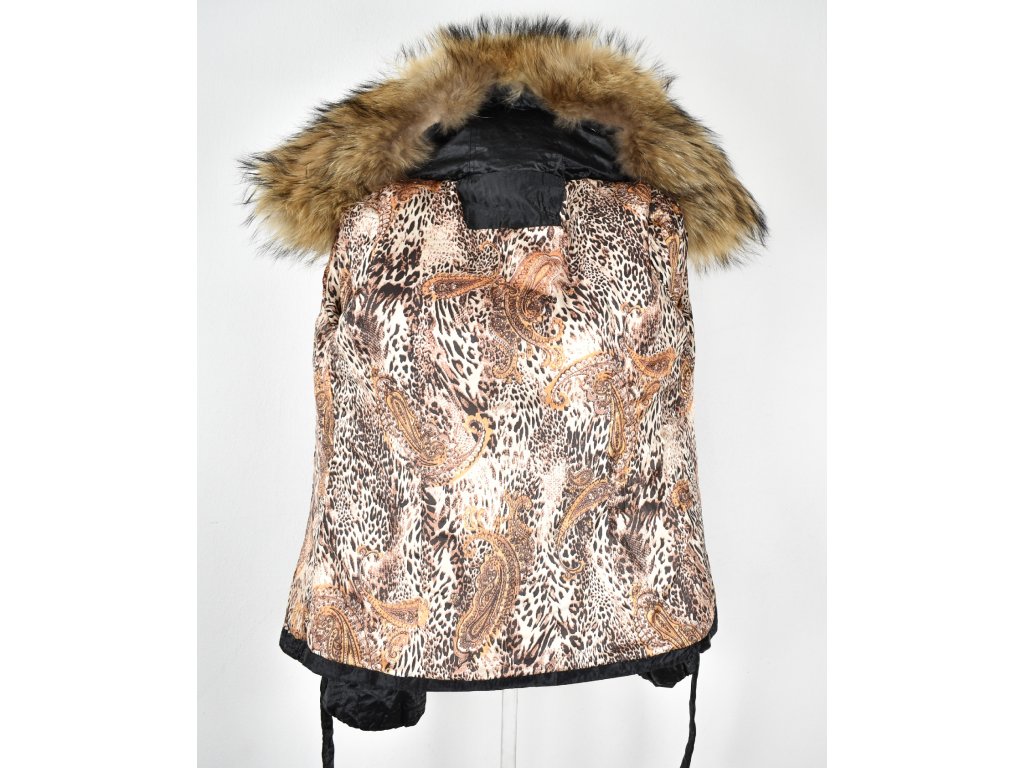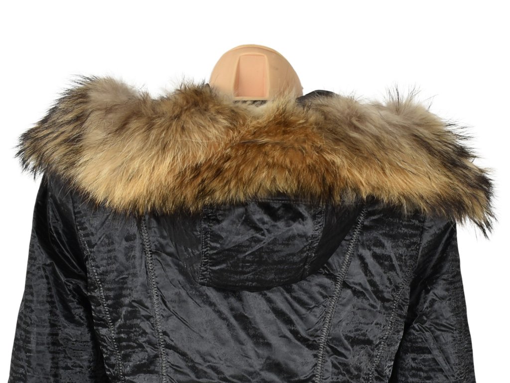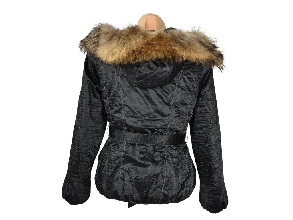 Dámský černý prošívaný kabát s kapucí s pravou kožešinou S/M