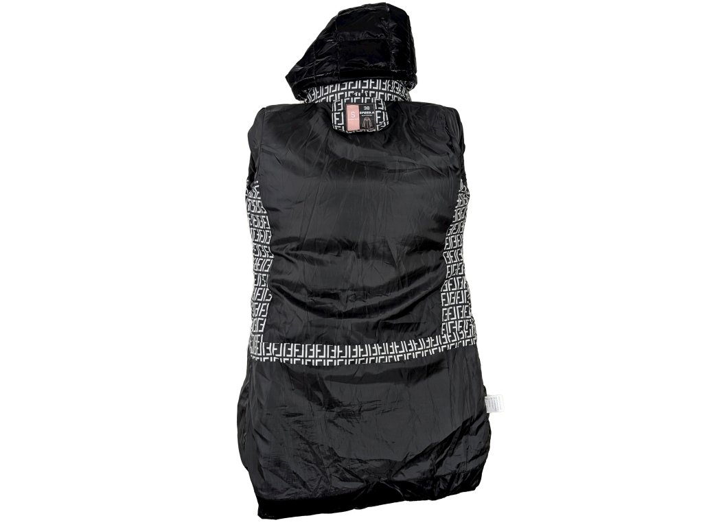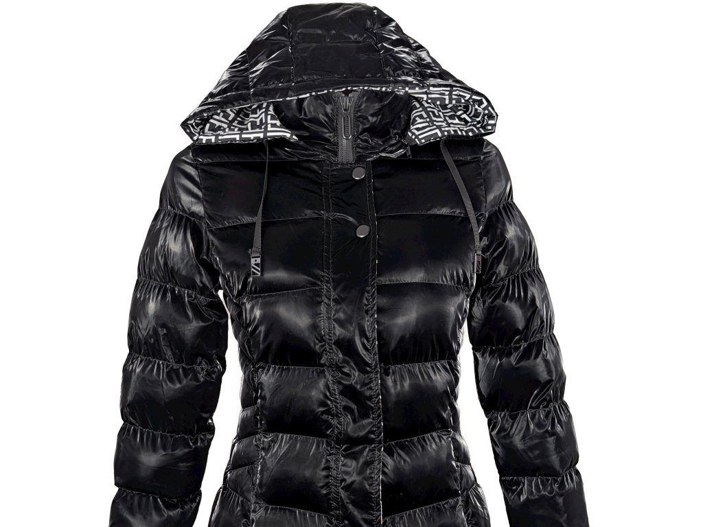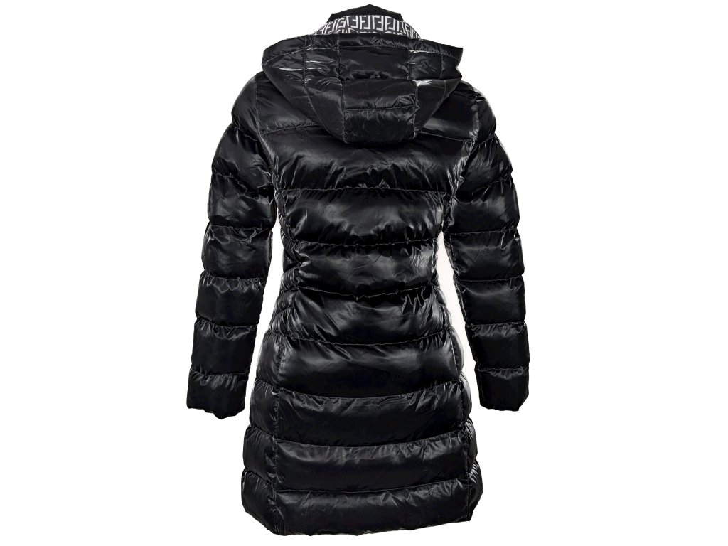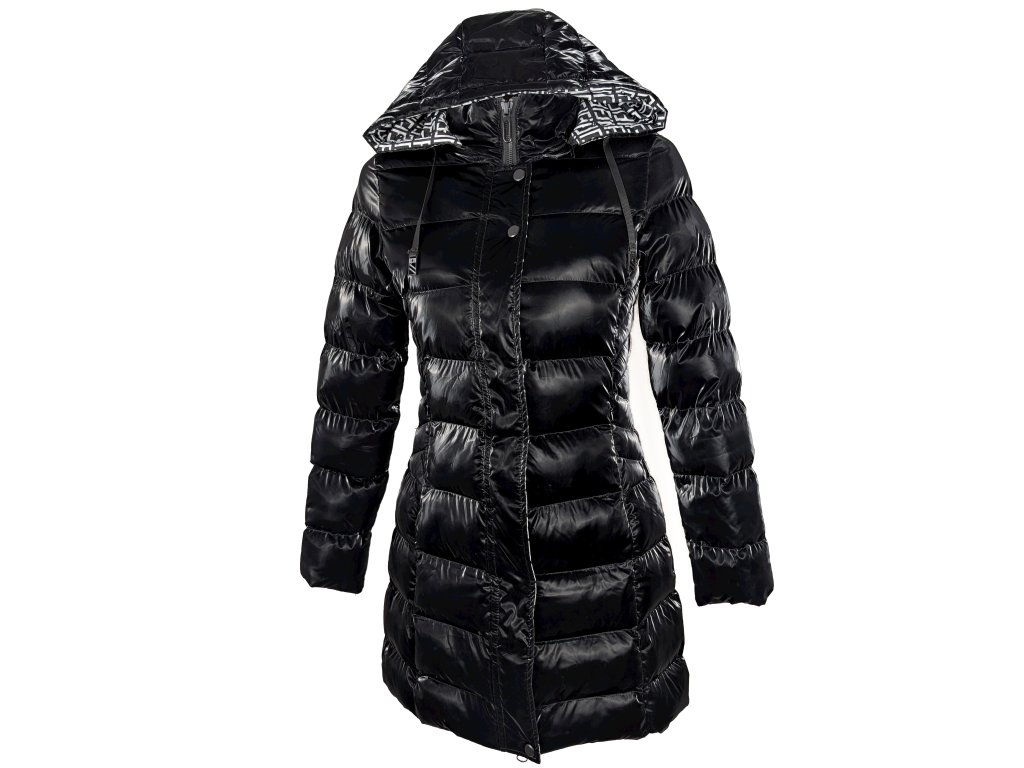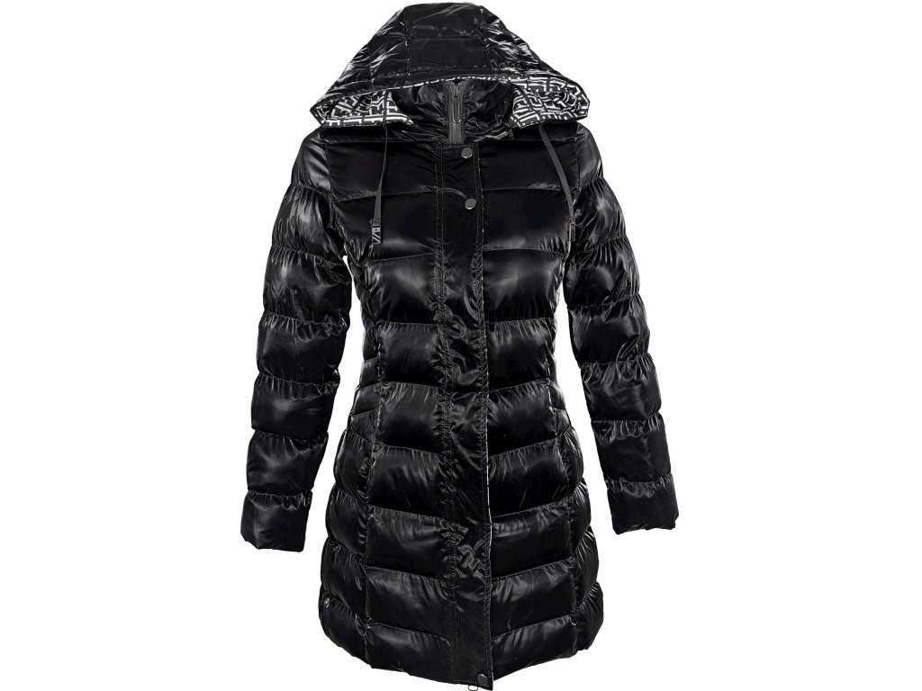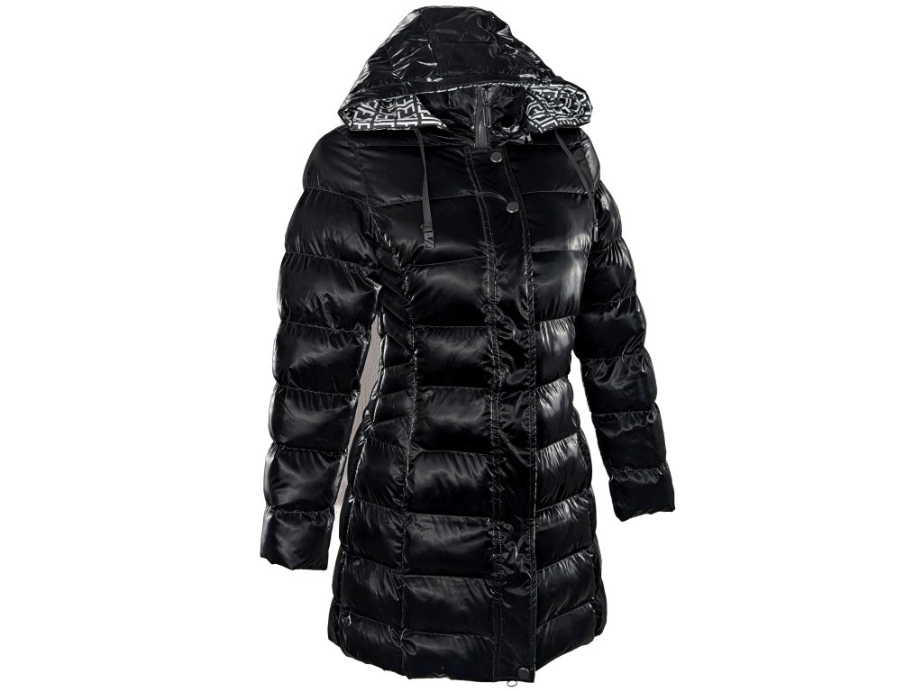 Dámský černý prošívaný lesklý kabát s kapucí S