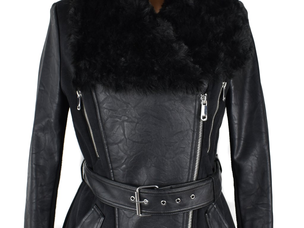 F&F, dámský černý koženkový křivák - kabát, kožíšek uvnitř, 100% PU, kožíšek napevno