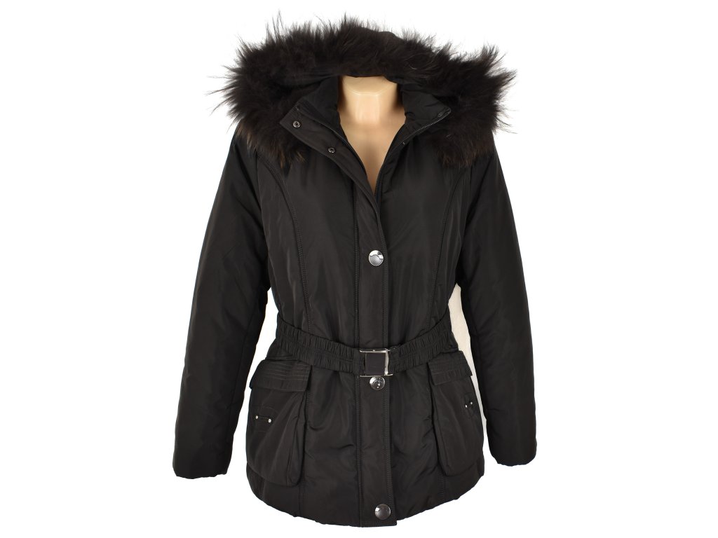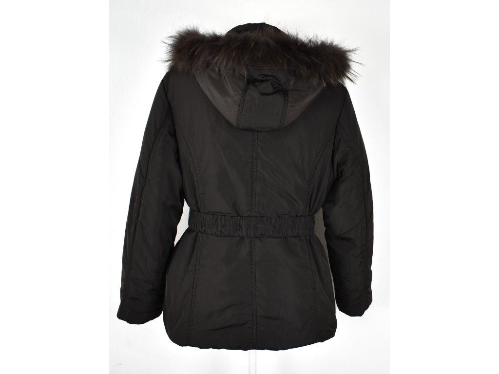 Dámský hnědý kabát s páskem a kapucí s pravou kožešinou XXL