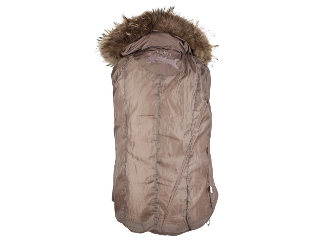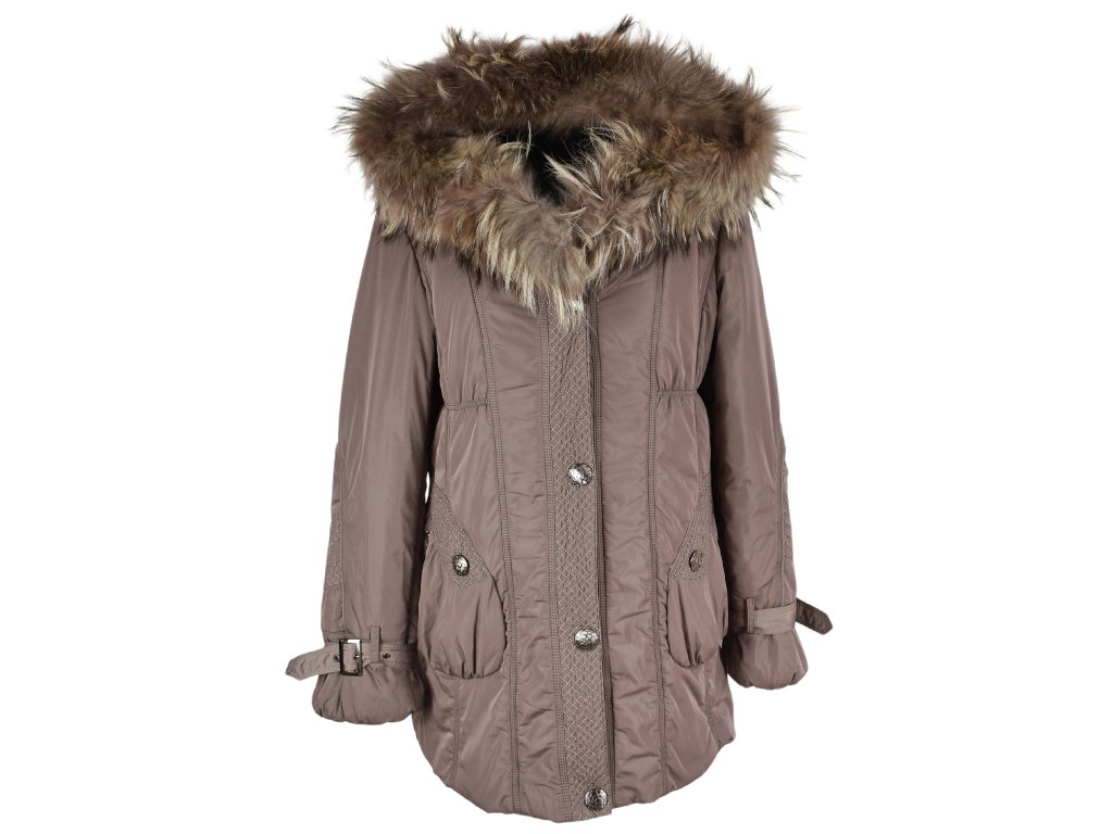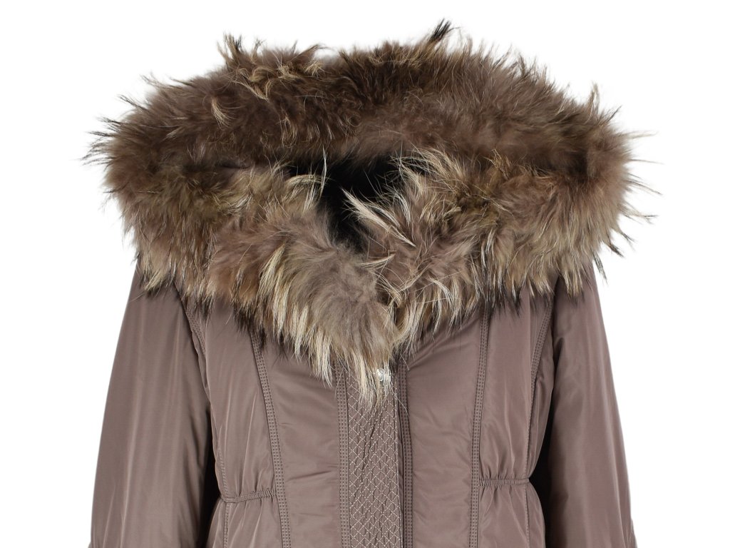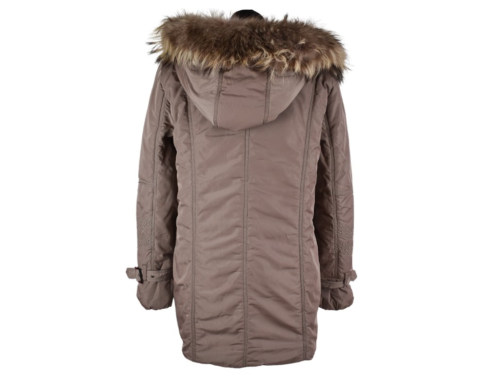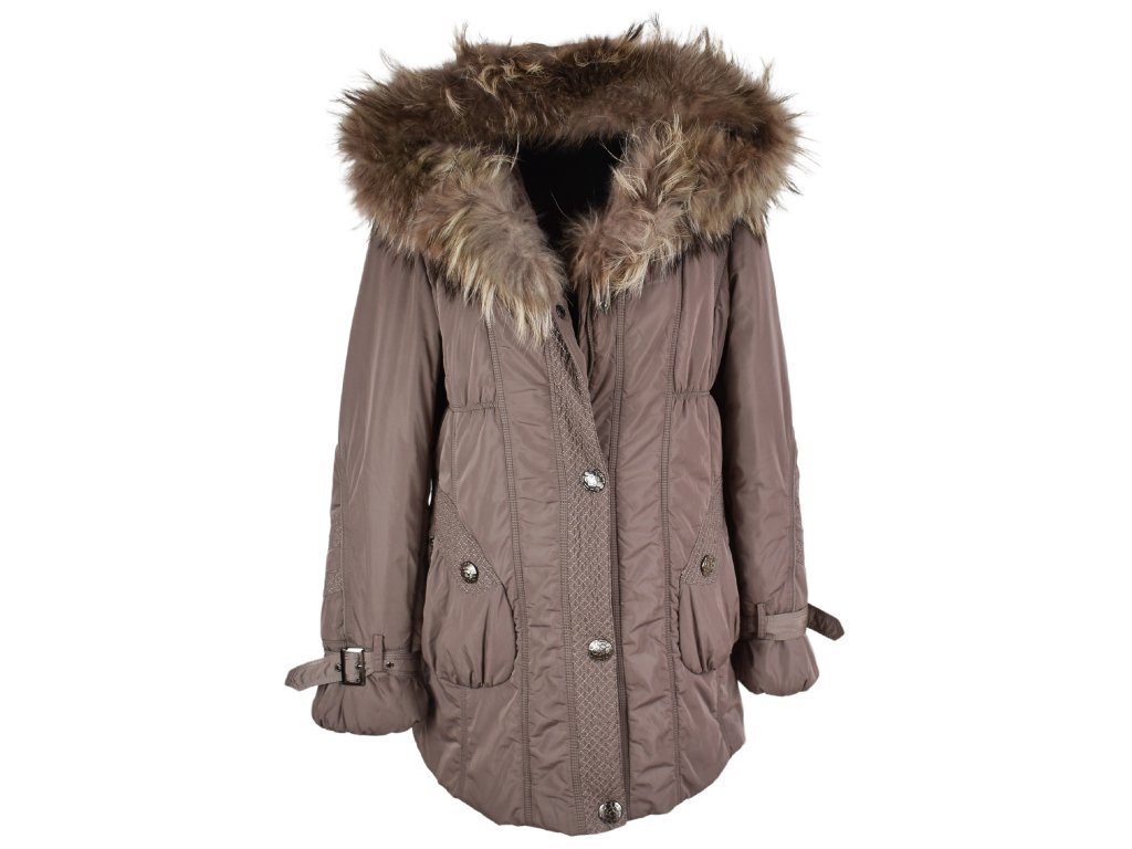 Dámský hnědý prošívaný kabát s kapucí s pravou kožešinou Leder Pellicce L