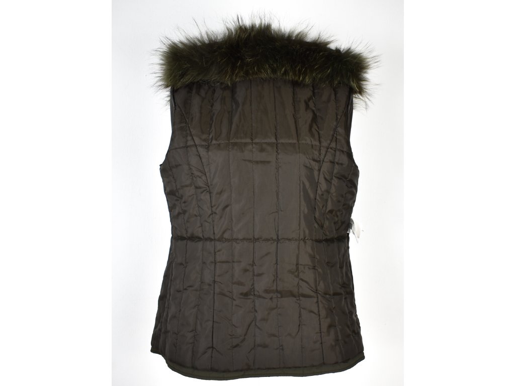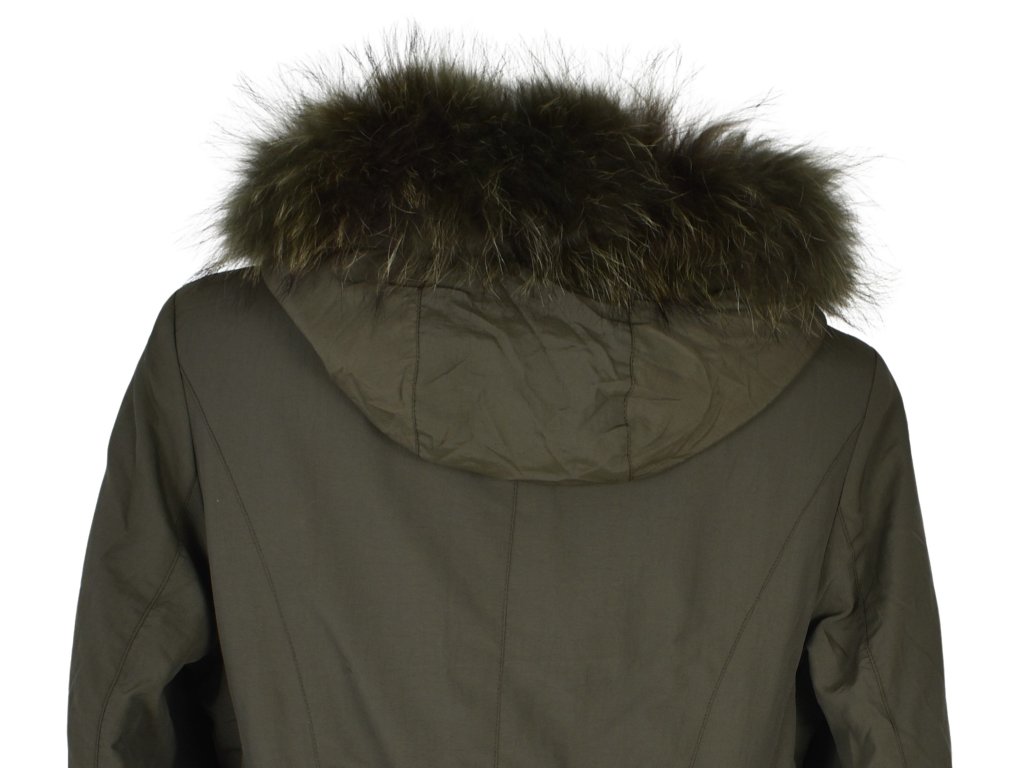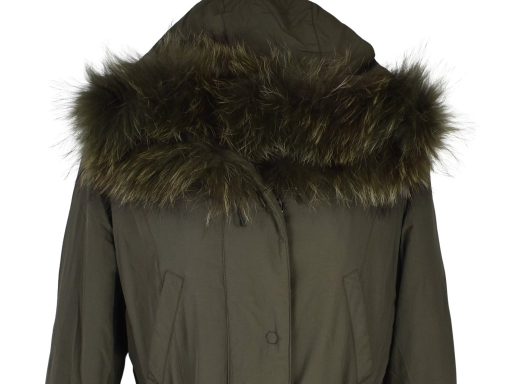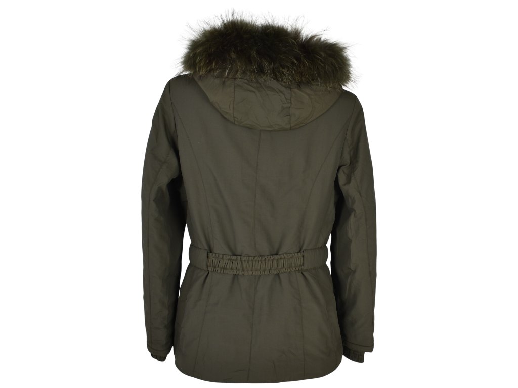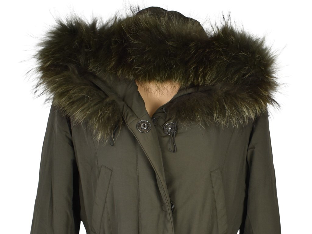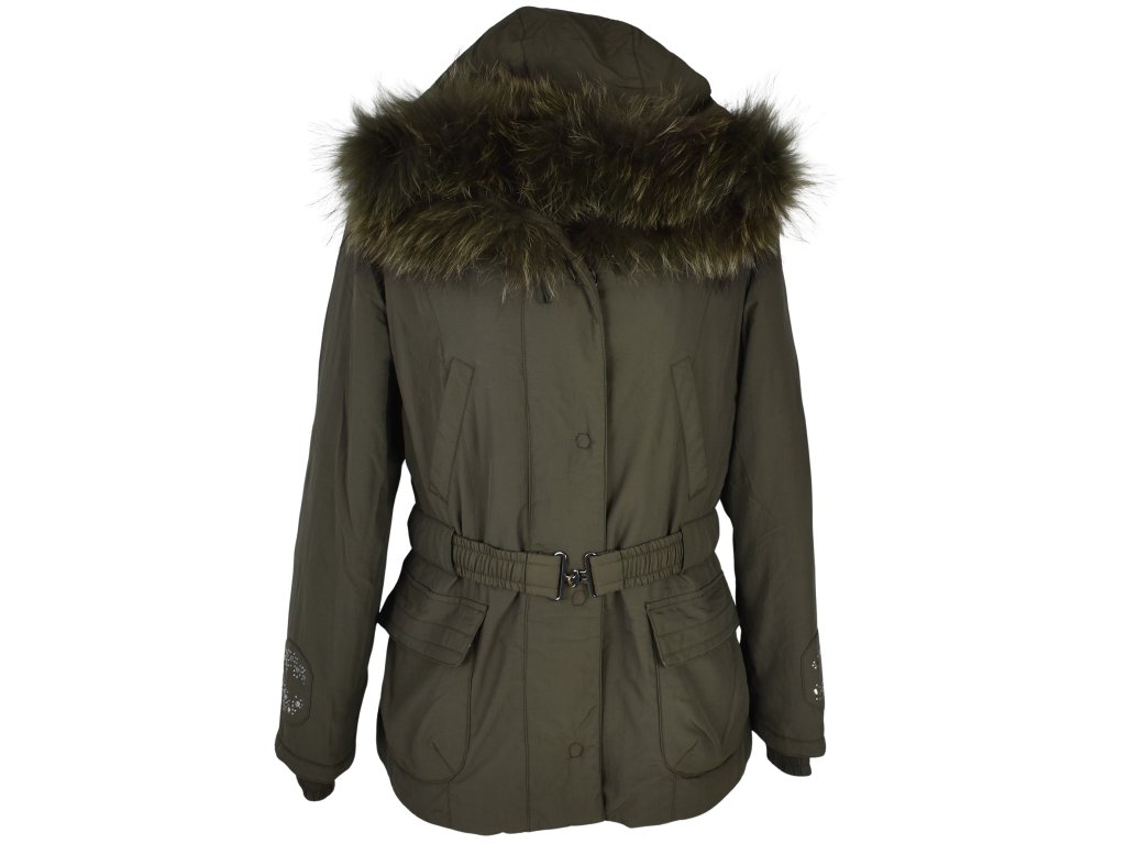 Dámský khaki zimní kabát s páskem a kapucí s pravou kožešinou 40