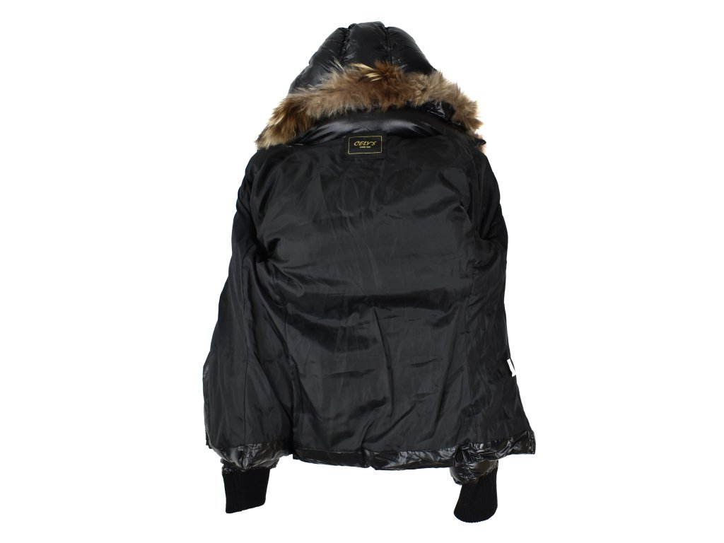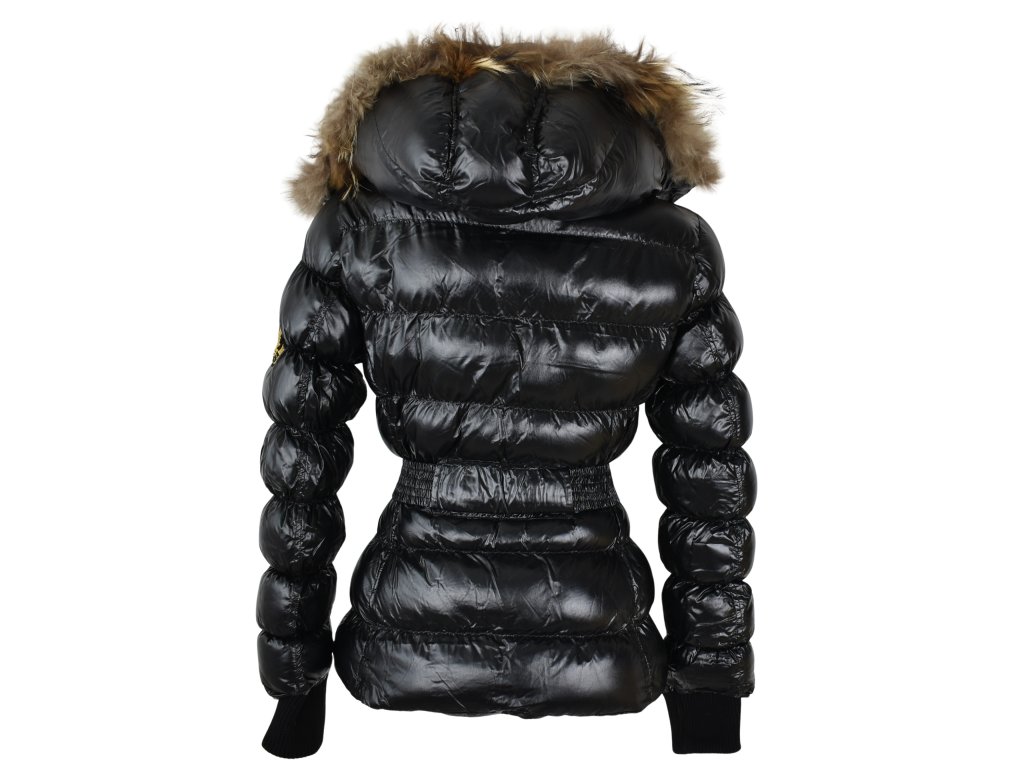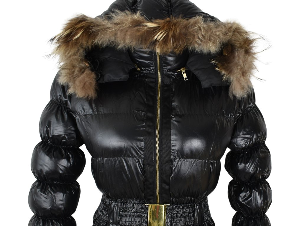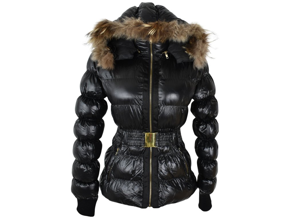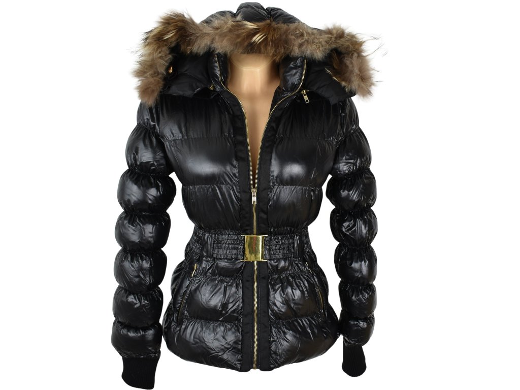 Dámský lesklý prošívaný kabát s páskem a kapucí s pravou kožešinou S