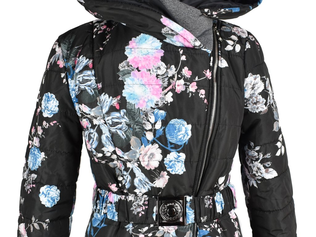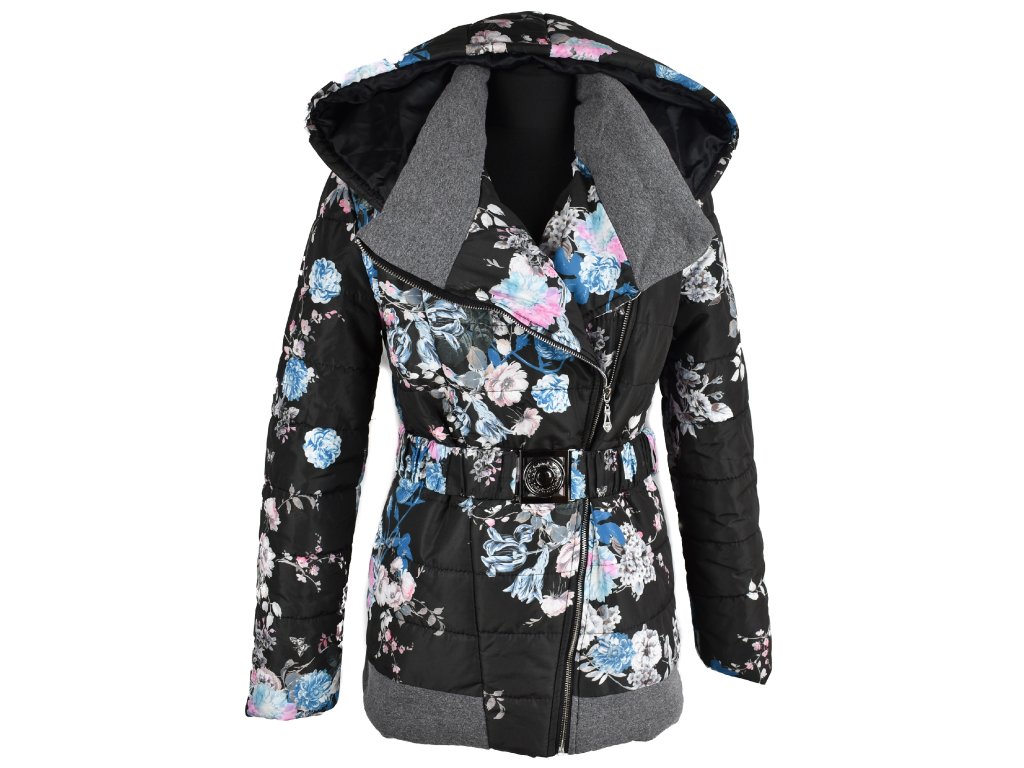 Dámský prošívaný kabát s květinovým vzorem s páskem a kapucí L