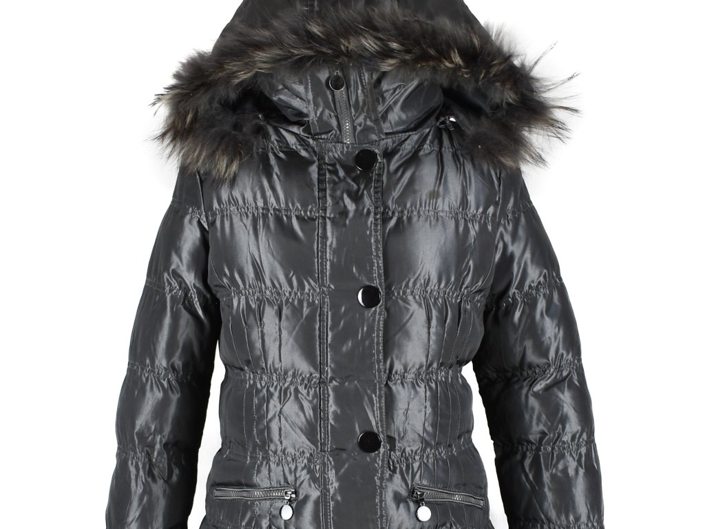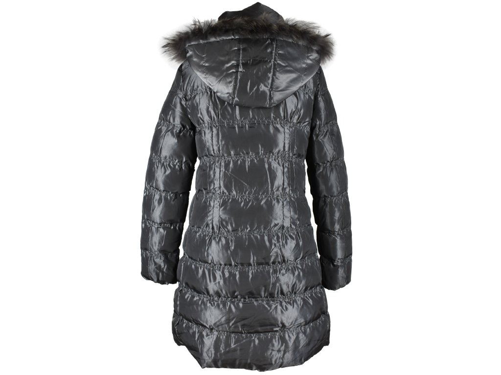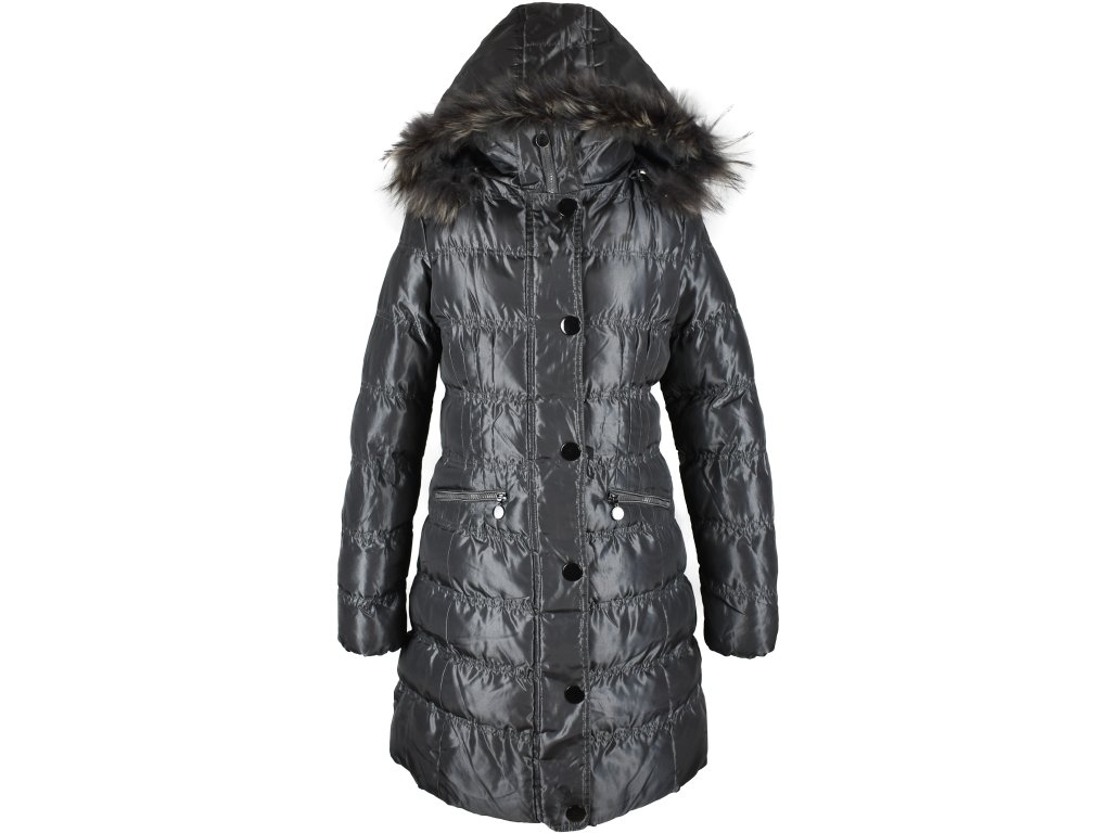 O&S Paris, prošívaný kovový dámský kabát, velikost M, odnimatelná kapuce s pravou kožešinou, 100% polyester
