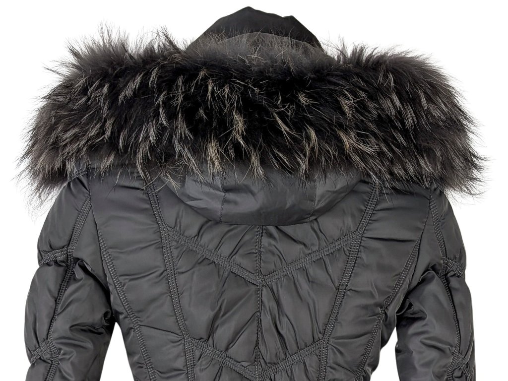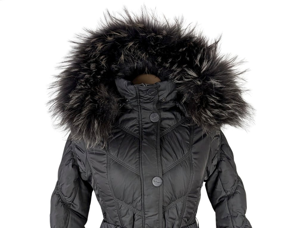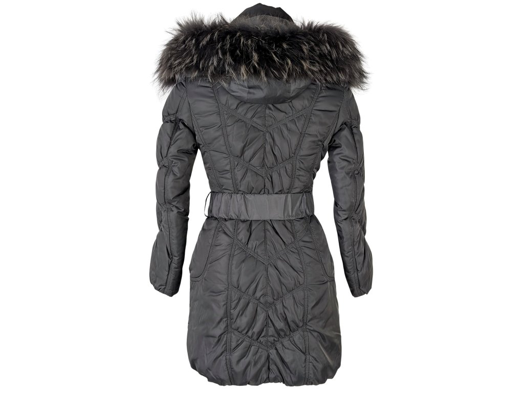 Dámský šedý prošívaný kabát s páskem a kapucí s pravou kožešinou XS