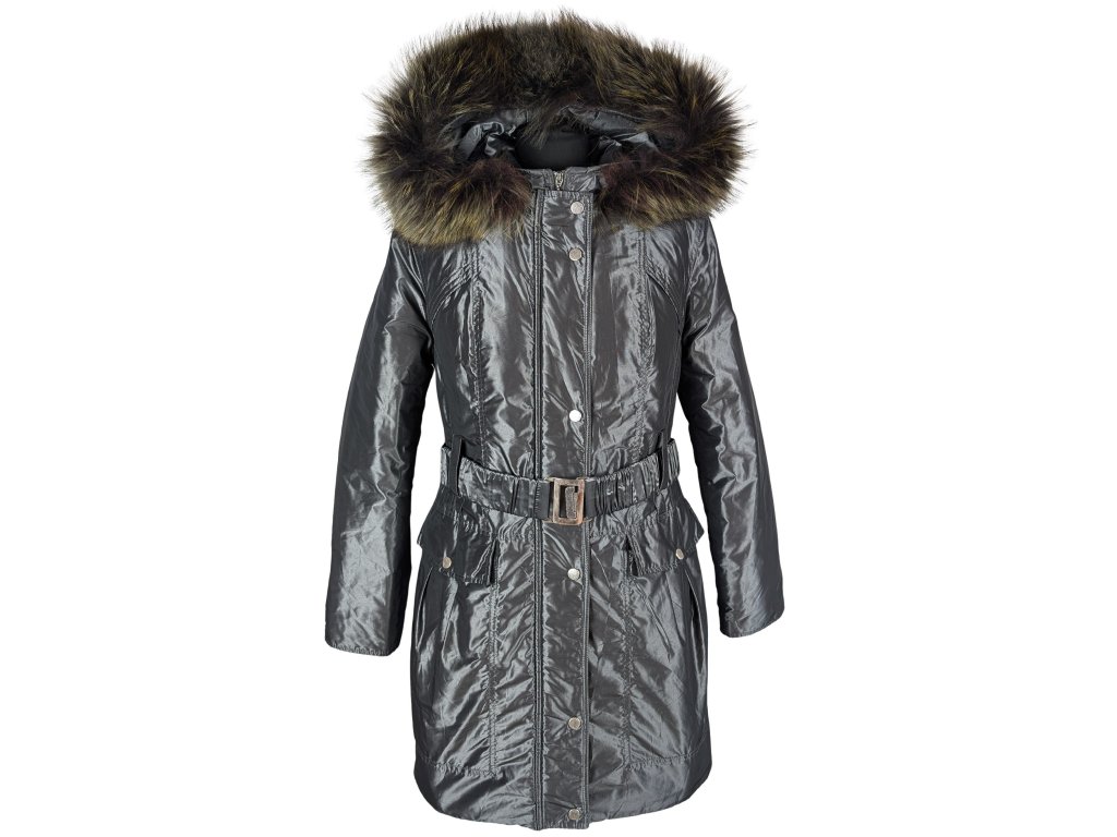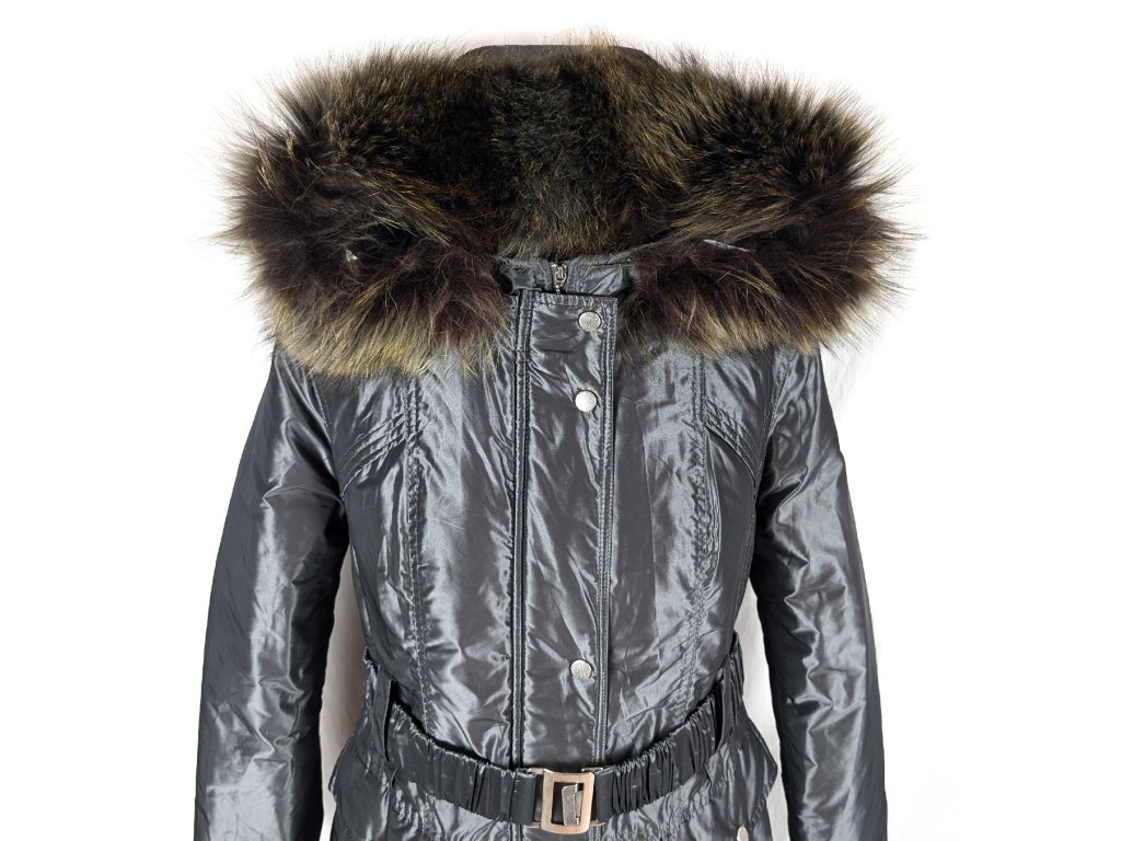 Dámský stříbrný kabát s páskem a kapucí s pravou kožešinou Yves Tanguy S