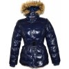 GATE, zateplená, na zip a cvoky, s páskem, odnimatelnou kapucí na zip, dámský kabát, modrý kabát s páskem, lesklý