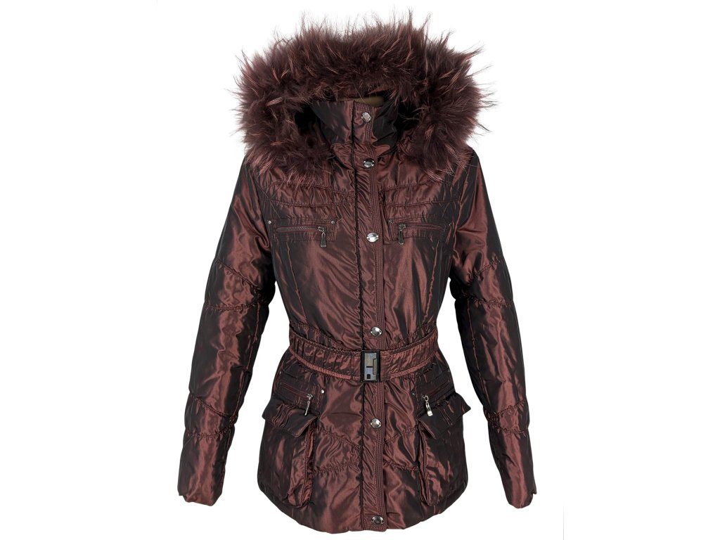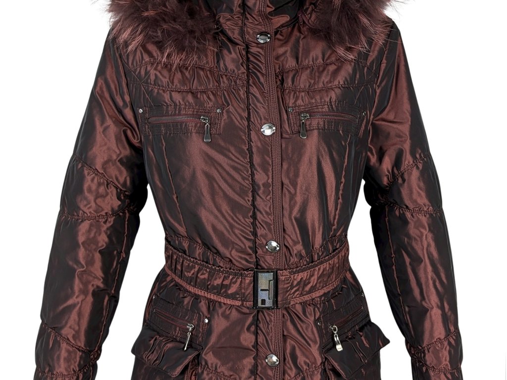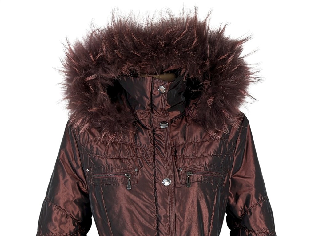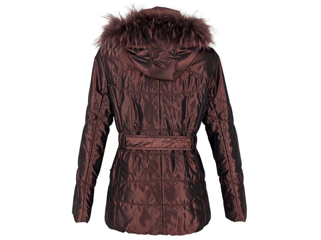 Dámský vínový prošívaný kabát s kapucí s pravou kožešinou Anorac 38, 40, 42