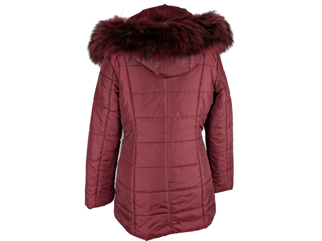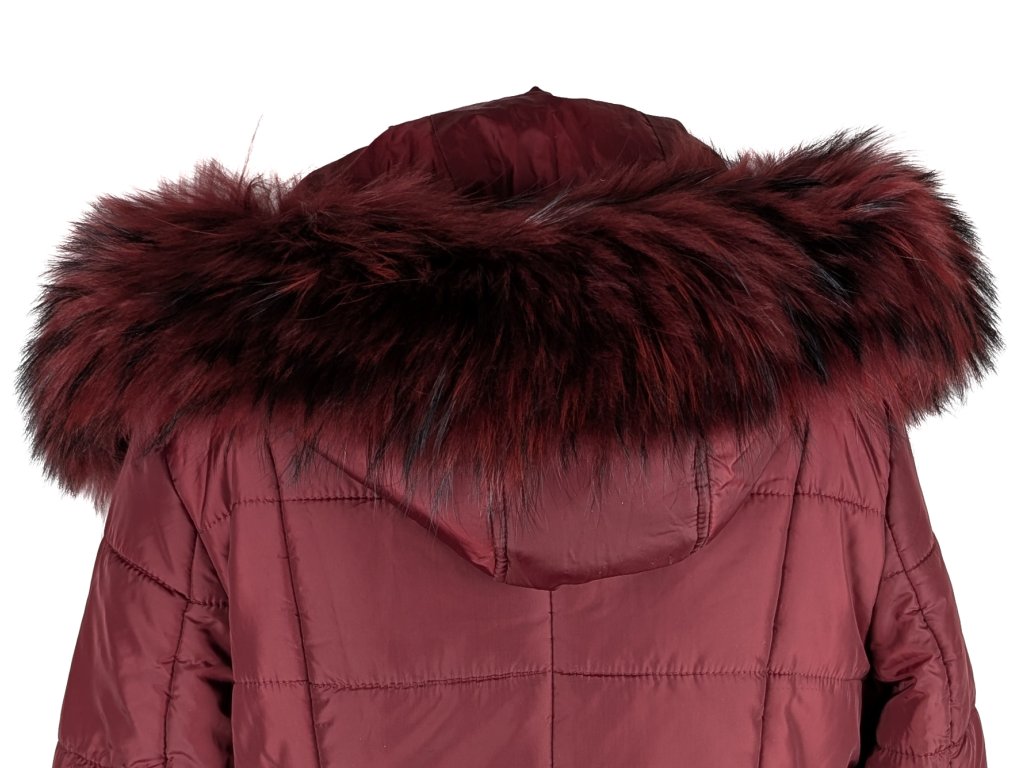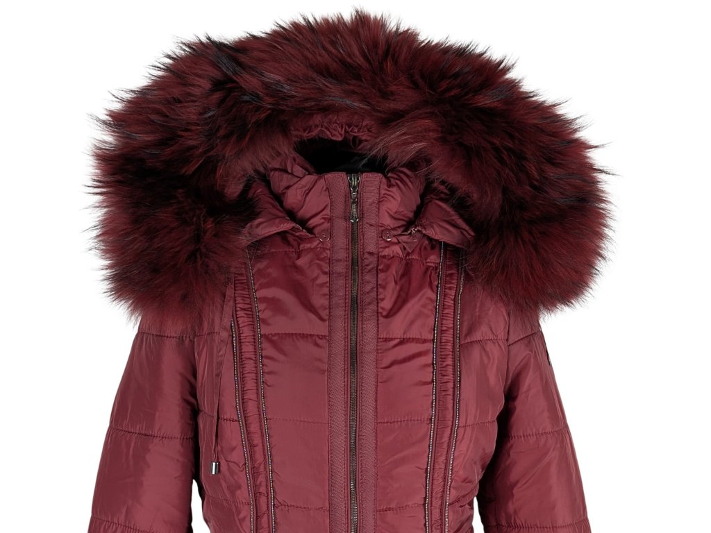 Dámský vínový prošívaný kabát s kapucí s pravou kožešinou Leder Pellicce M
