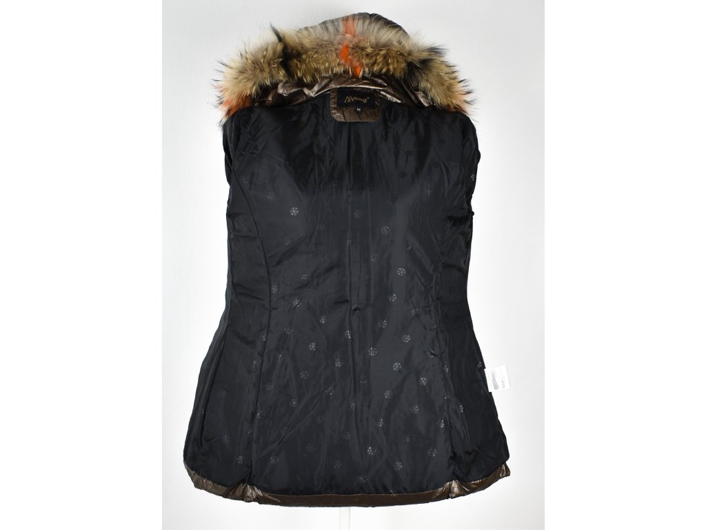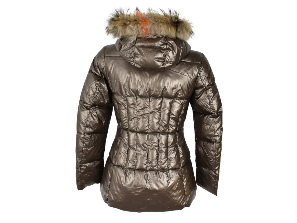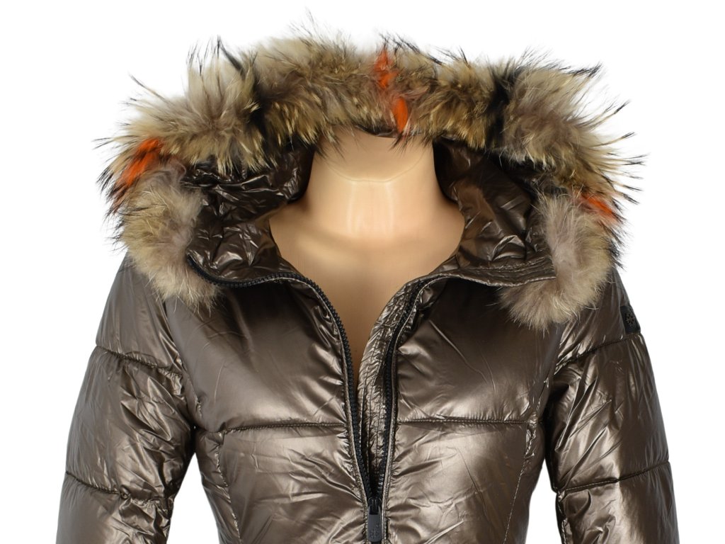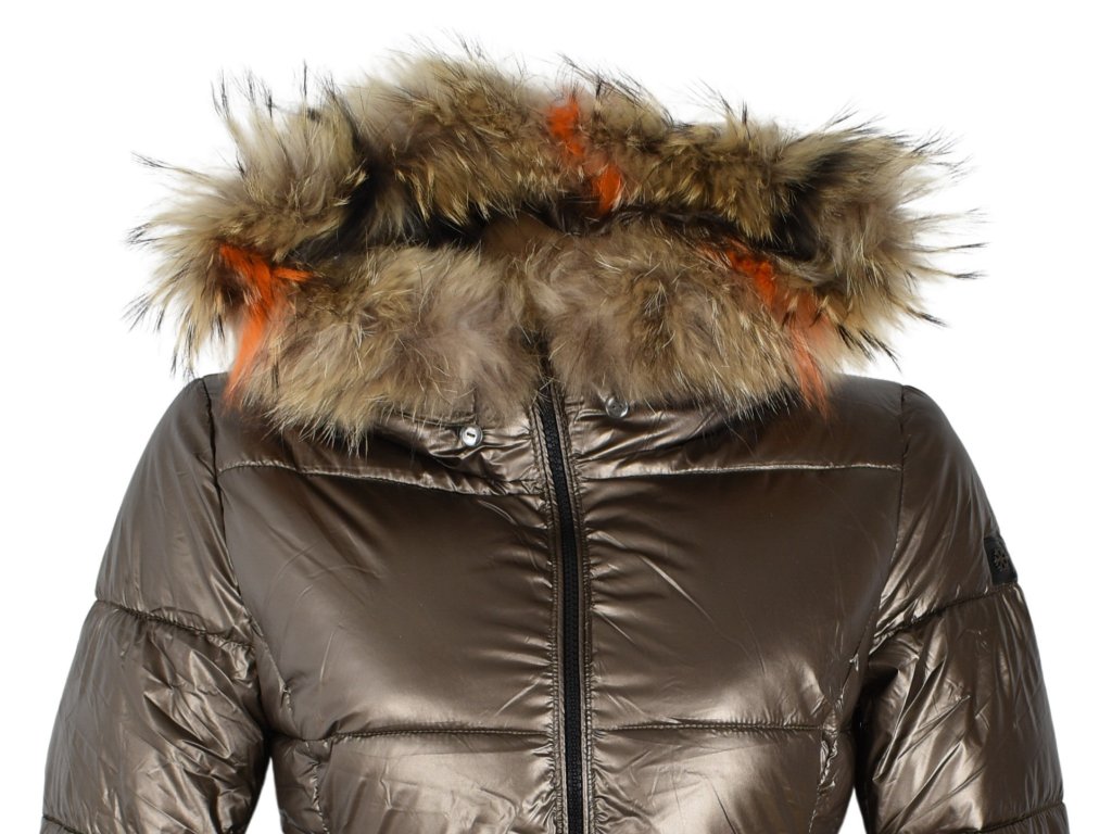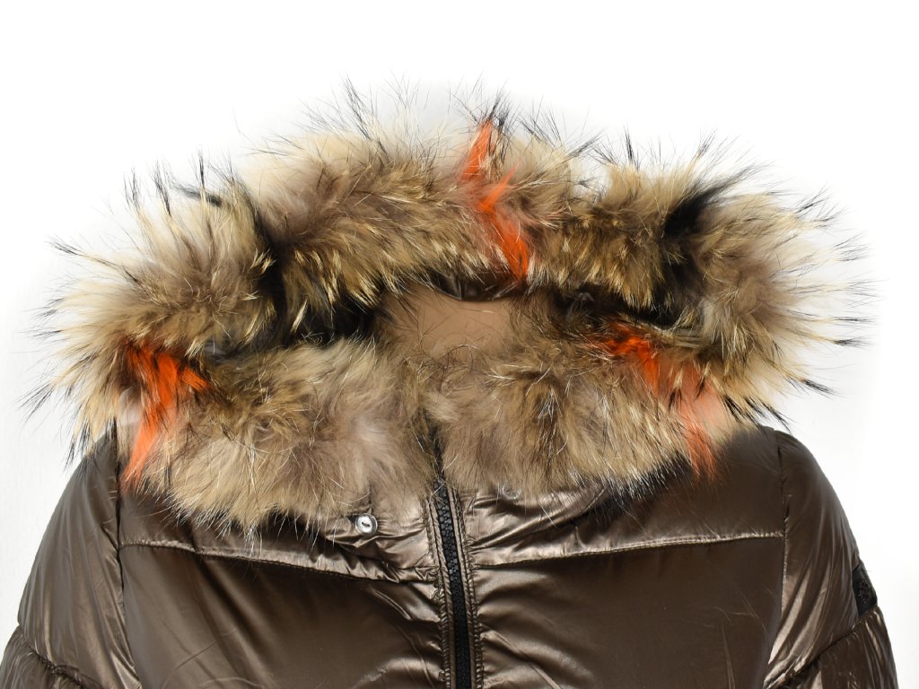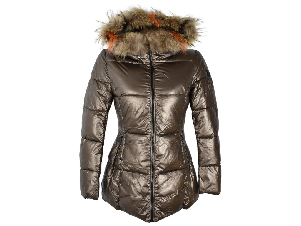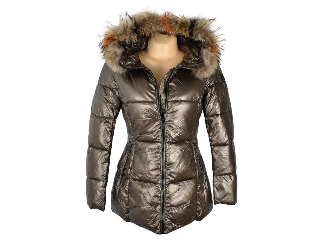 Dámský zlatý prošívaný kabát s kapucí s pravou kožešinou Moda Piu Anna S
