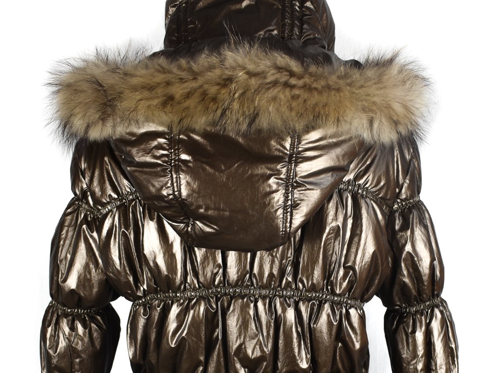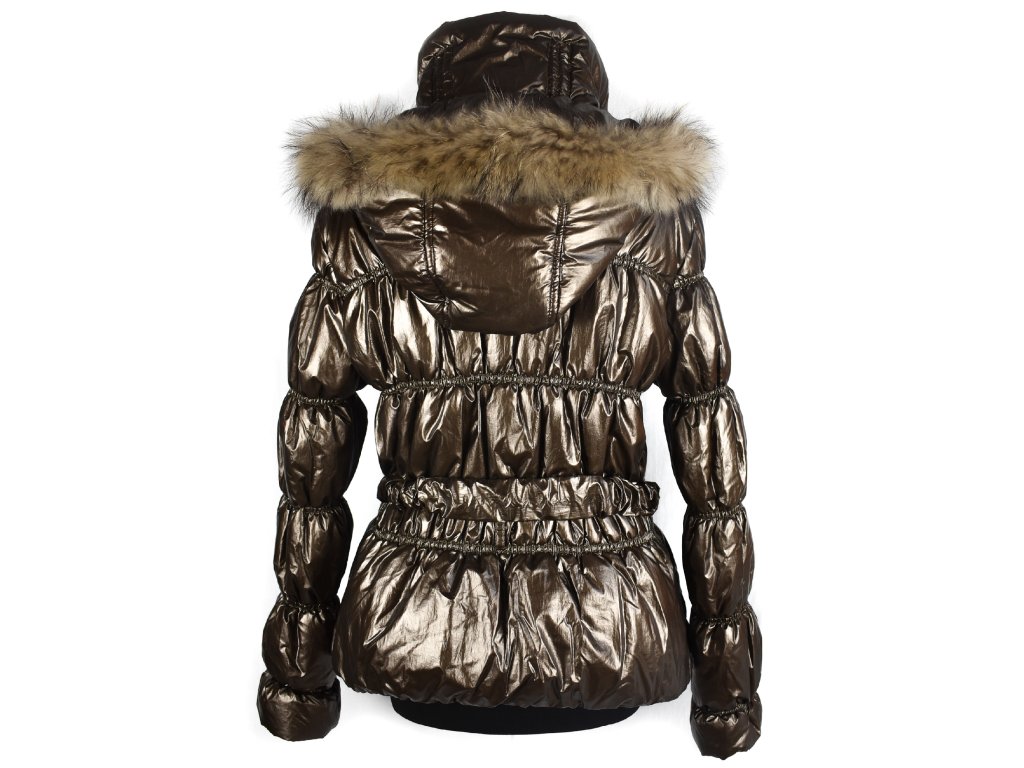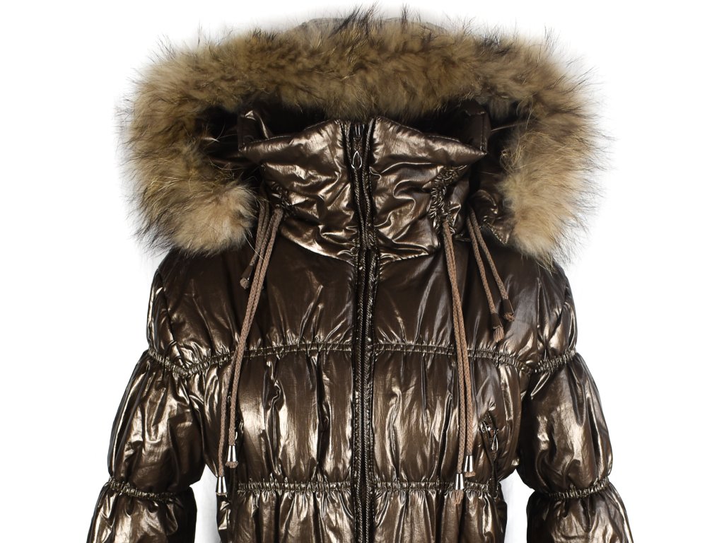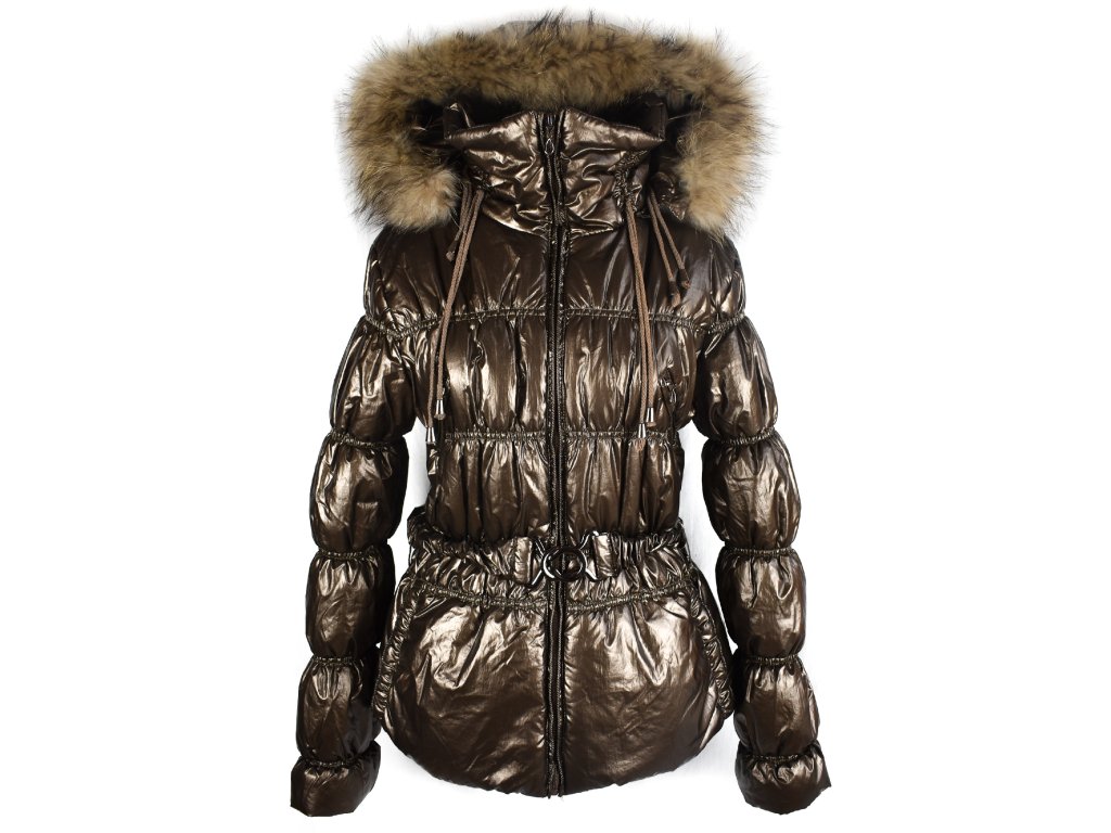Dámský zlatý prošívaný kabát s páskem a kapucí s pravou kožešinou Wishid L