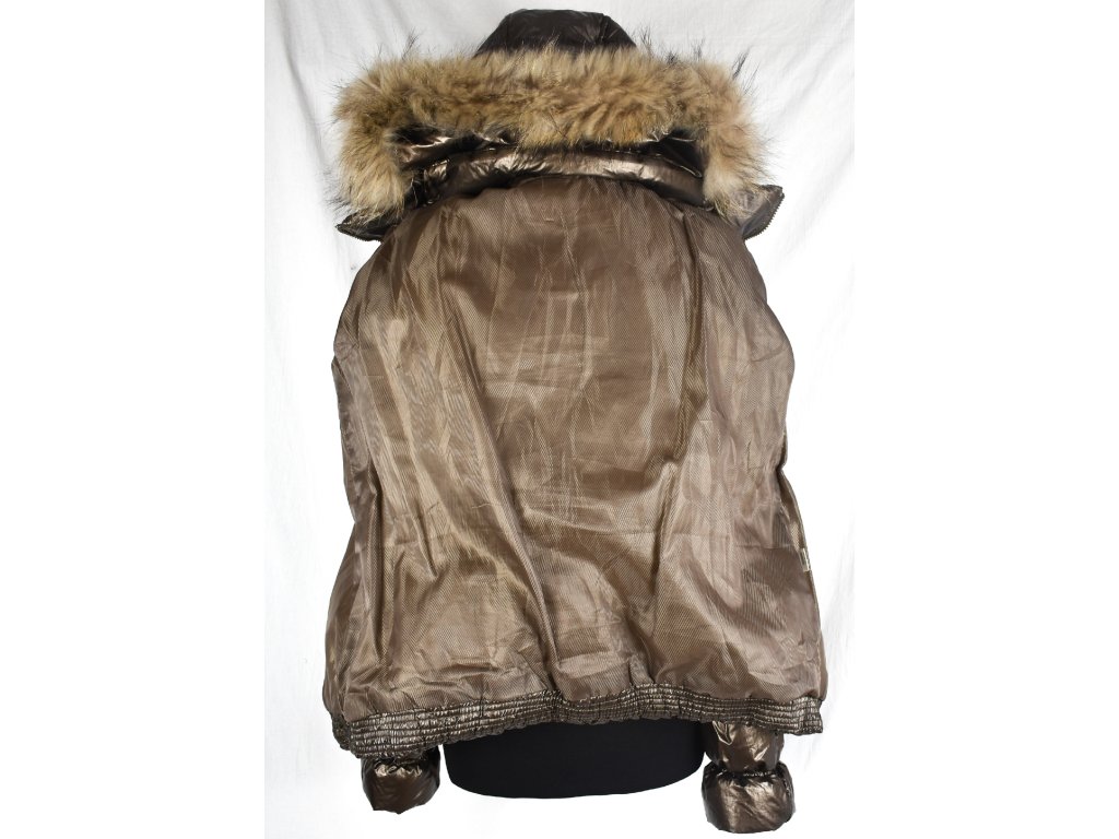 Dámský zlatý prošívaný kabát s páskem a kapucí s pravou kožešinou Wishid L, 100% polyester