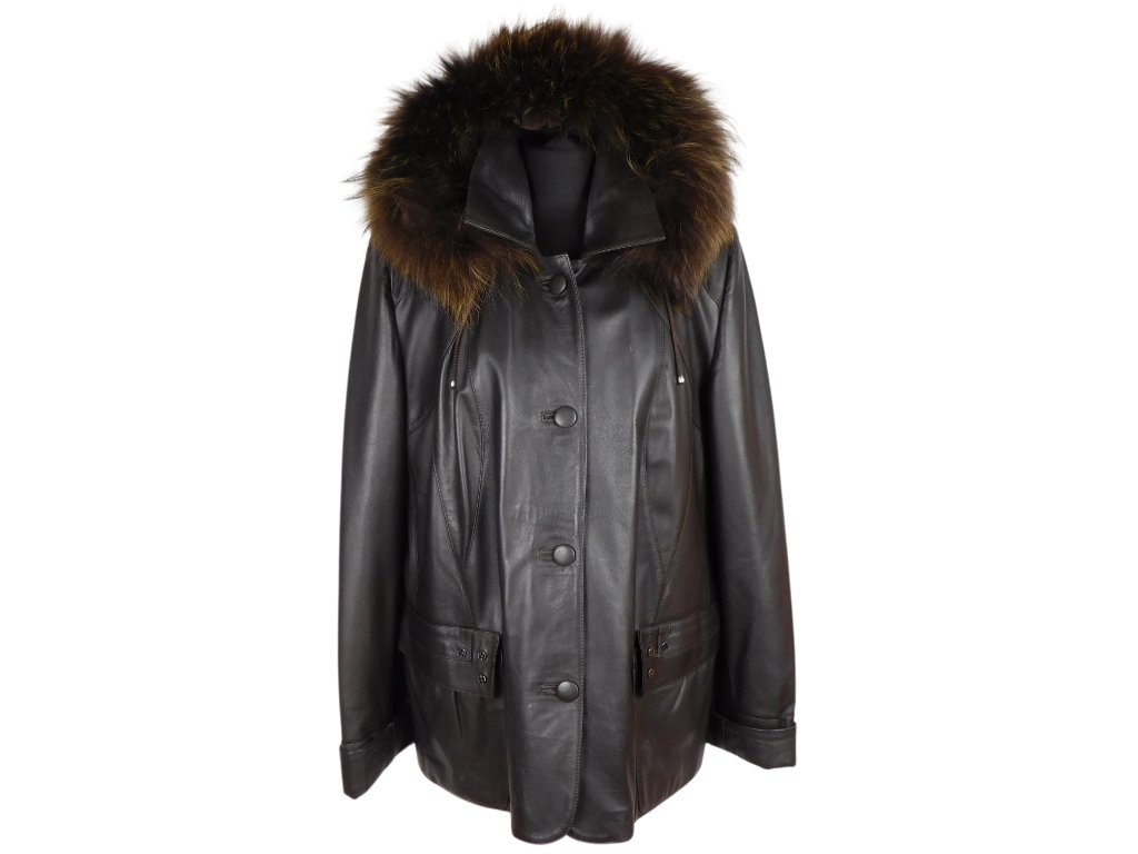 Kožená dámská tmavě hnědá bunda s pravou kožešinou K STYLE XXL*