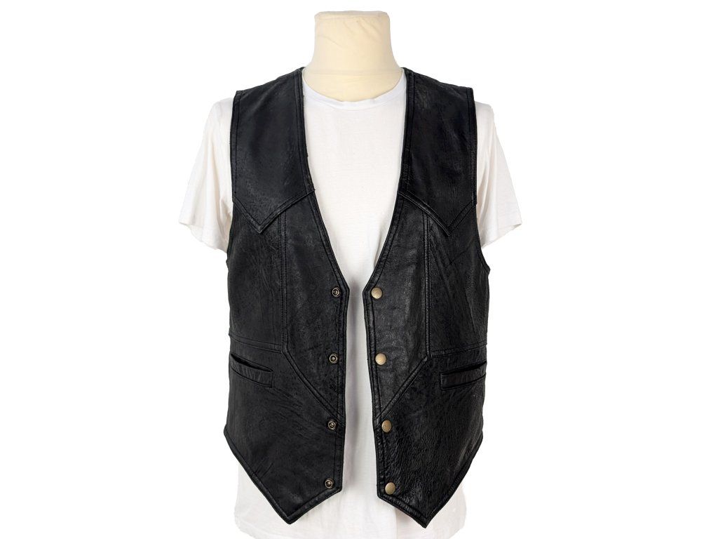 KOŽENÁ pánská černá vesta na zip 50/52 Měkká kůže Prsa: 55 cm (110 cm obvod) Pas: 54 cm (108 cm obvod)...