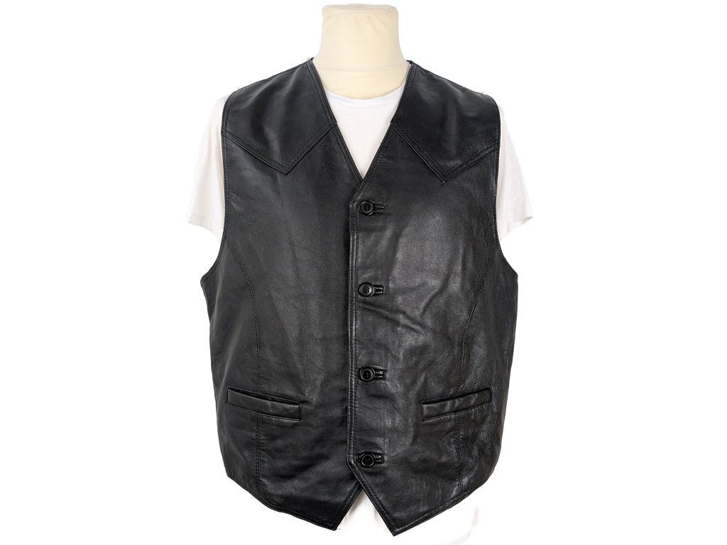 KOŽENÁ pánská černá vesta XL Měkká kůže Prsa: 59 cm (118 cm obvod) Pas: 56 cm Délka: 63 cm
