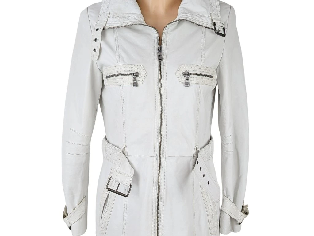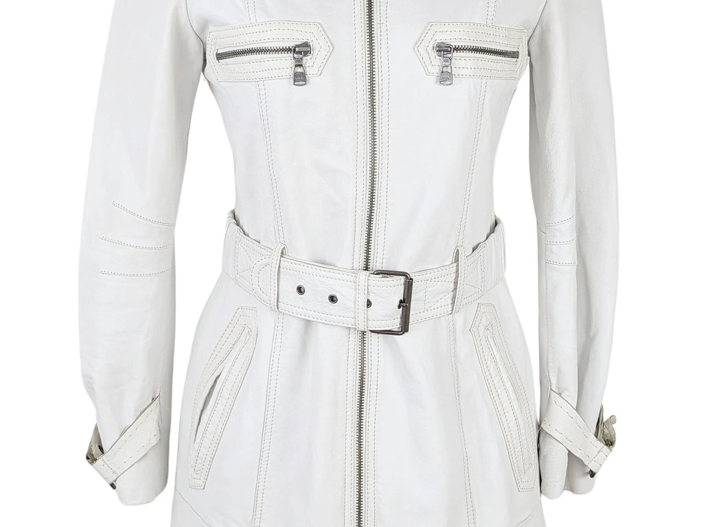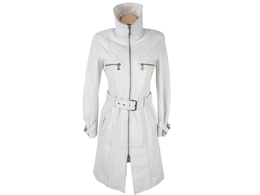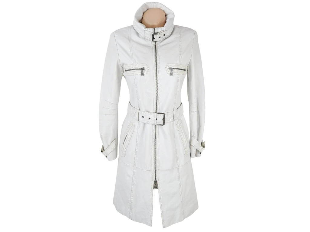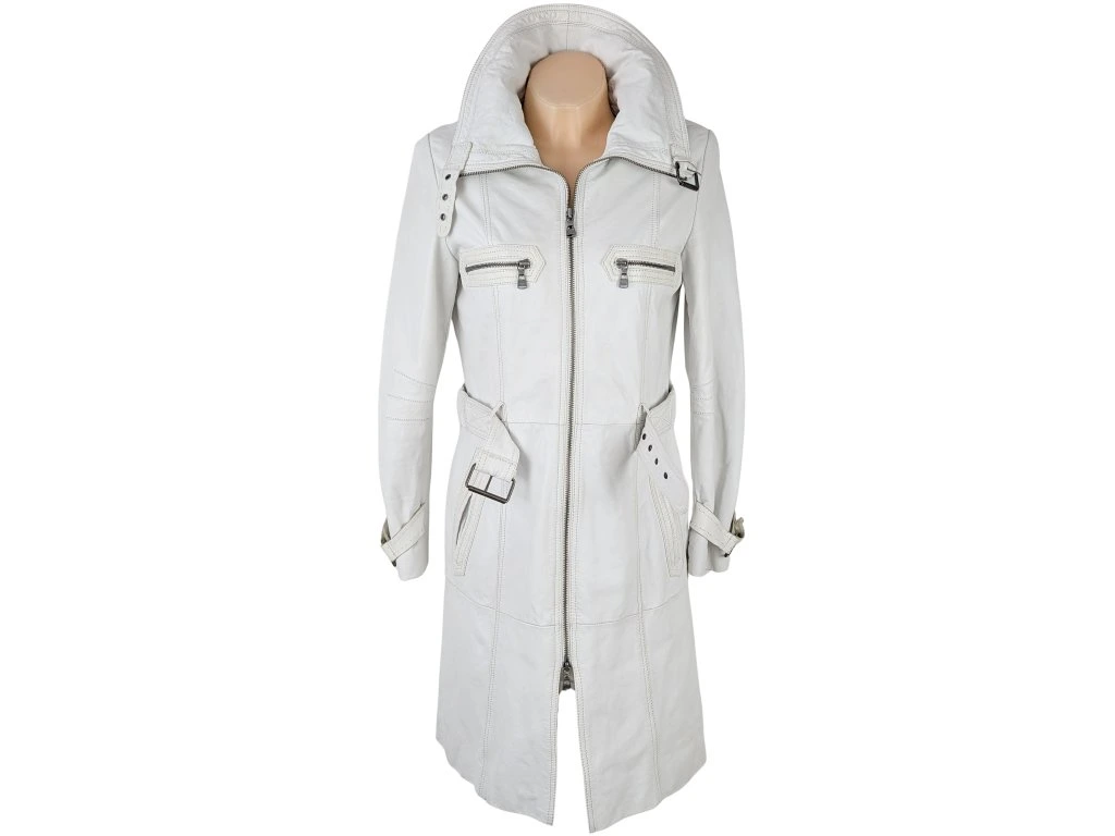 KOŽENÝ dámský bílý dlouhý kabát s páskem KARA 38
