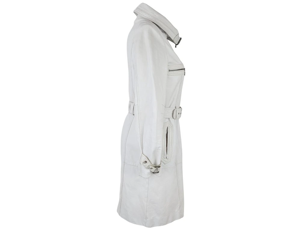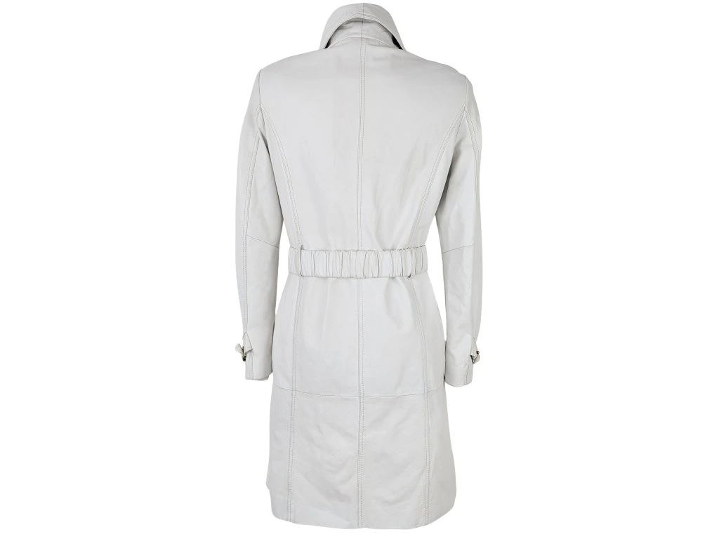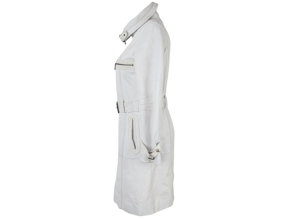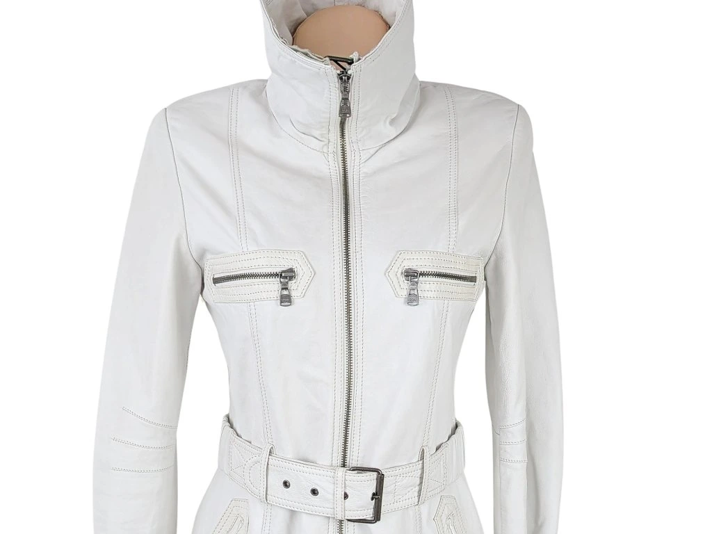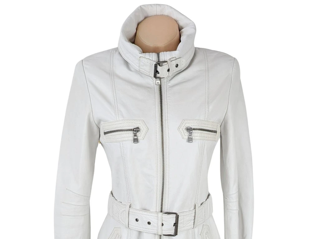 KOŽENÝ dámský bílý dlouhý kabát s páskem KARA 38