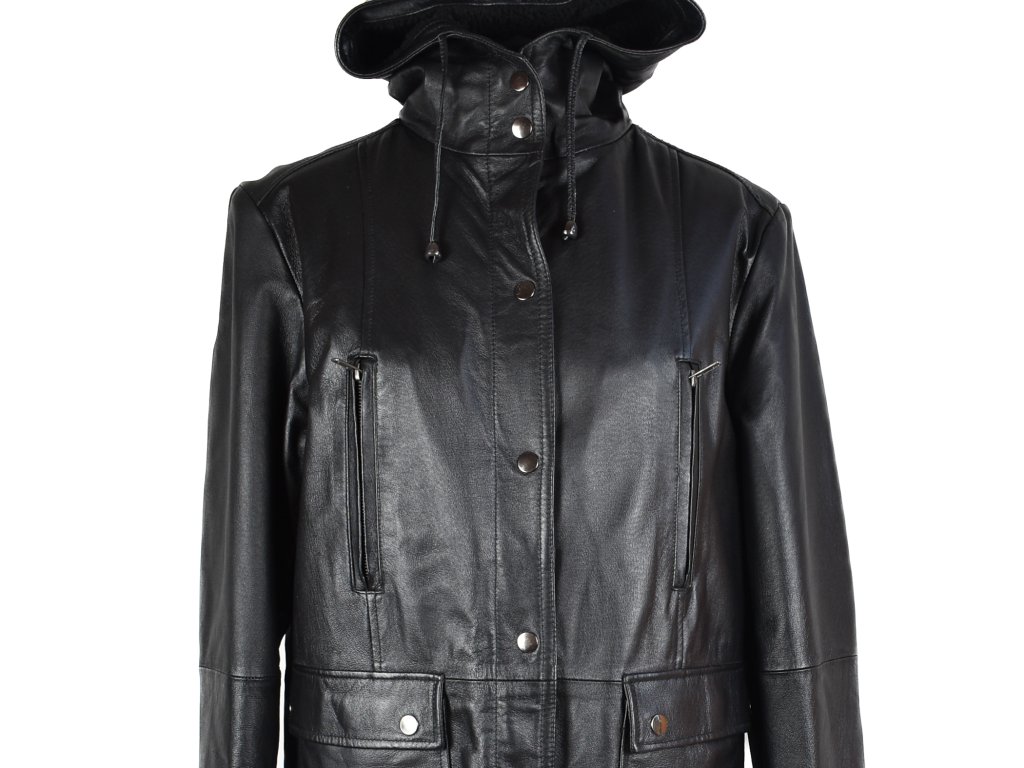 KOŽENÝ dámský černý zimní dlouhý kabát s kapucí S/M, M, XXL