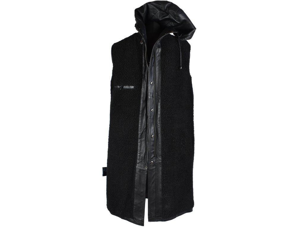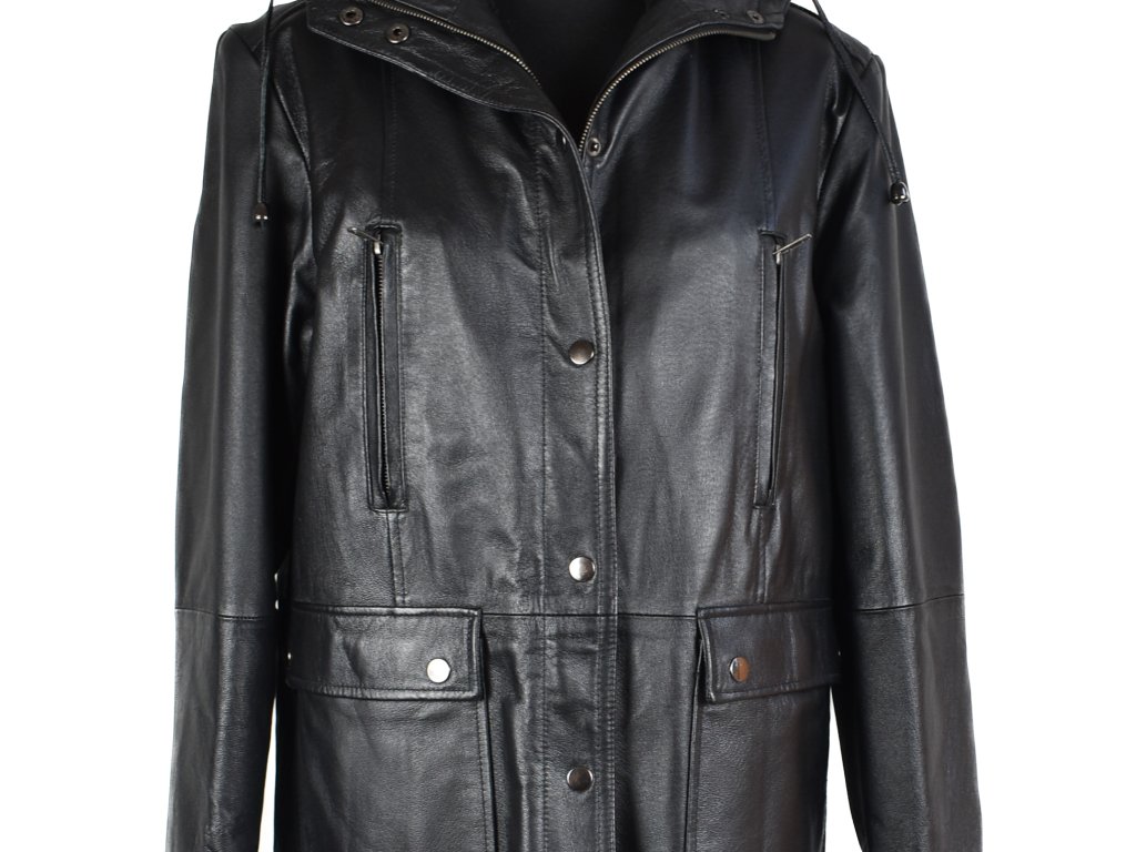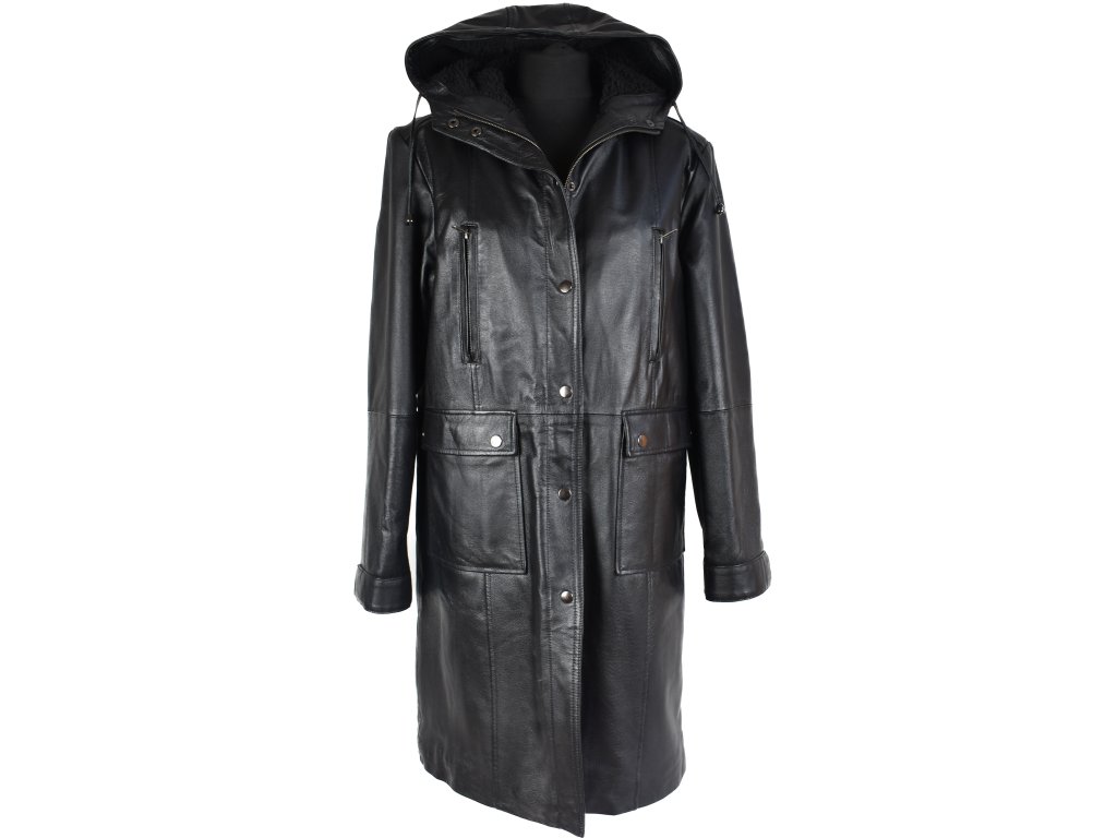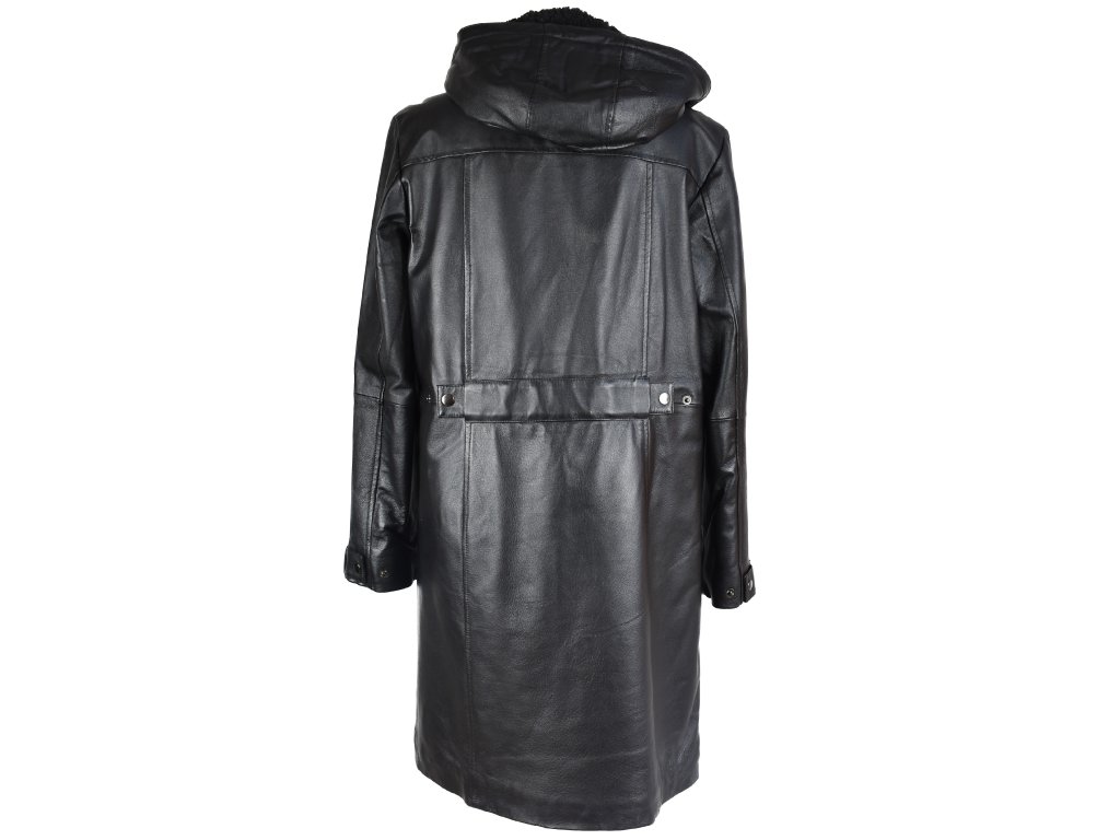 KOŽENÝ dámský černý zimní dlouhý kabát s kapucí