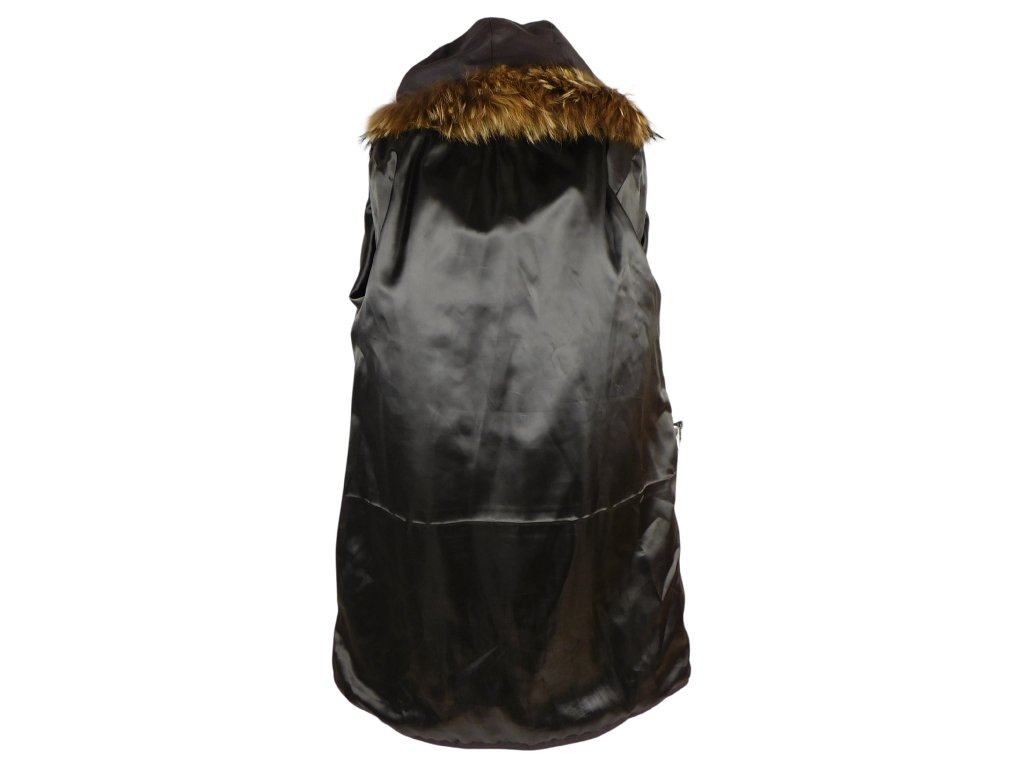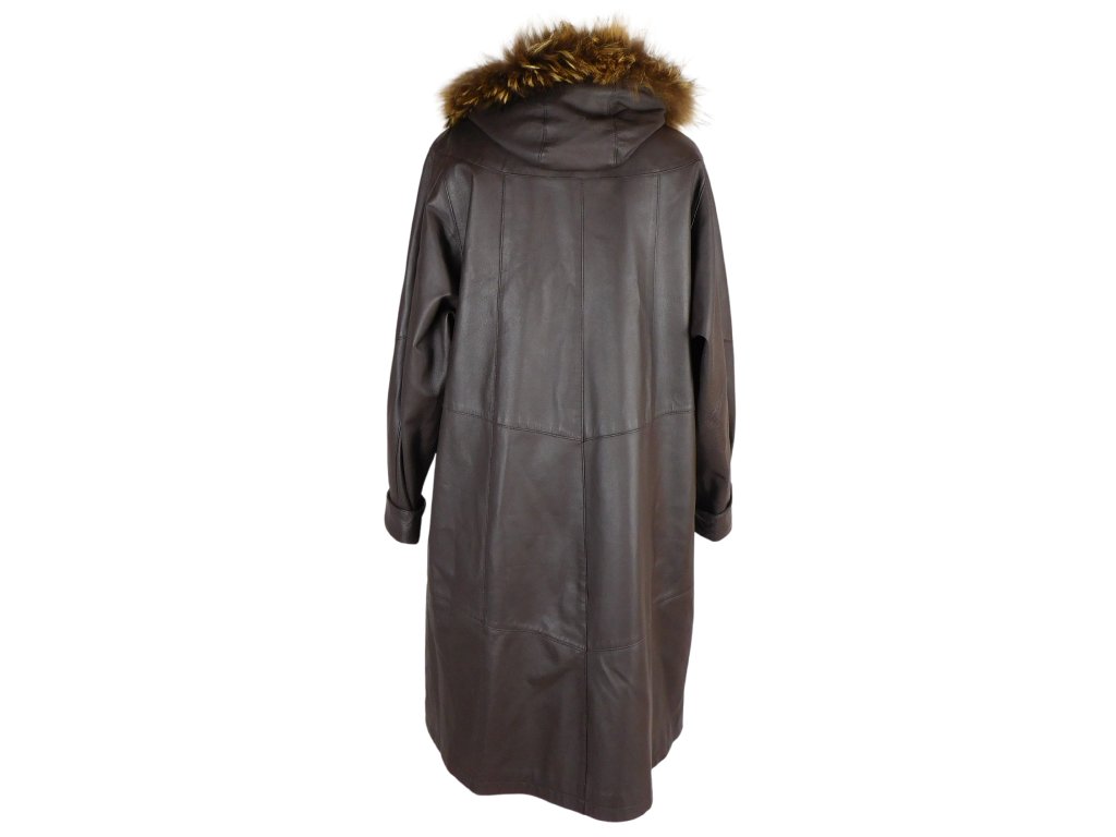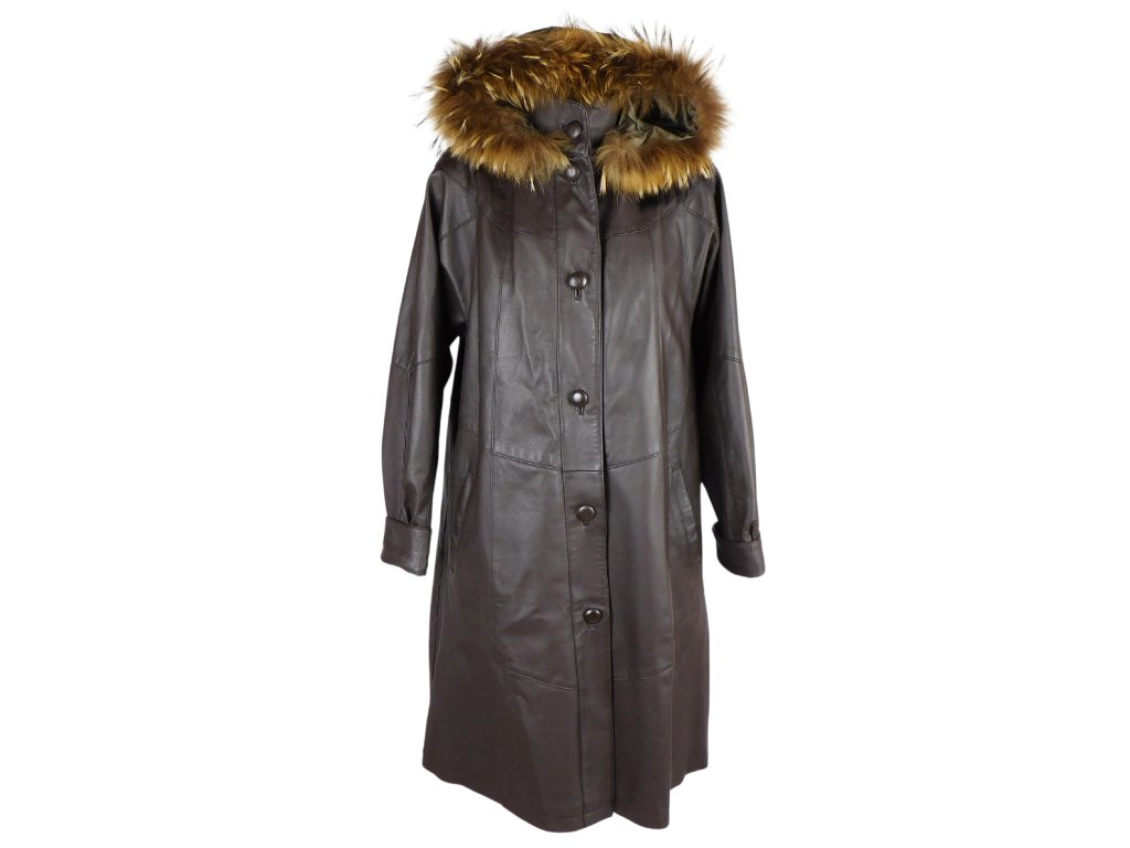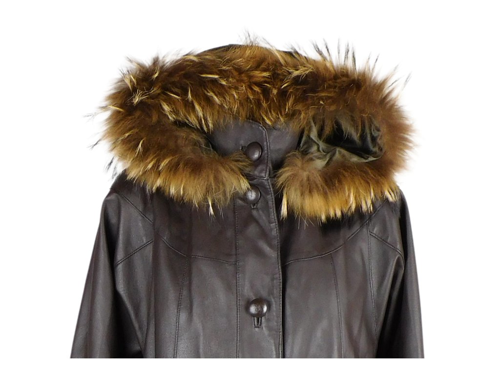 Kožený dámský dlouhý hnědý kabát s pravou kožešinou