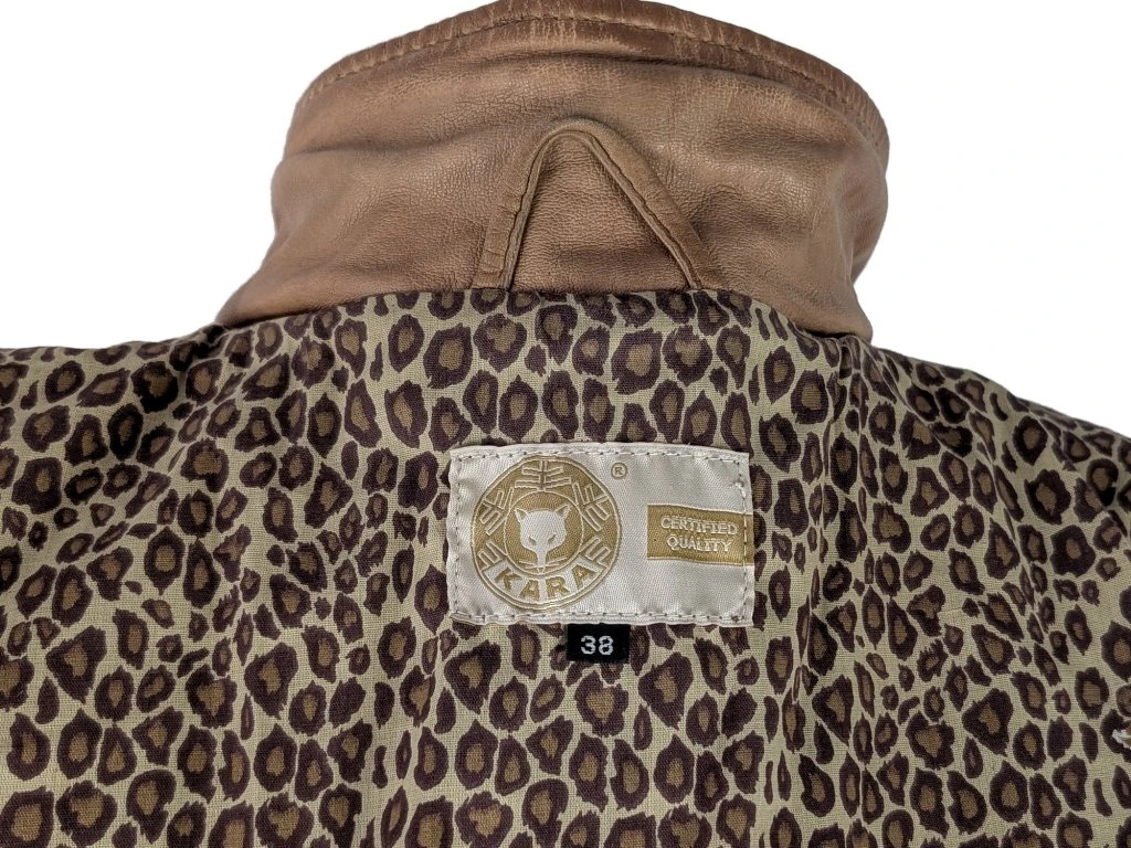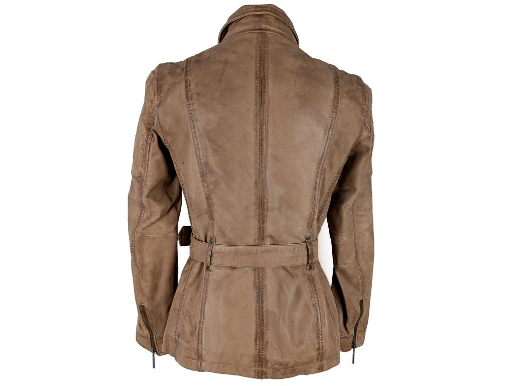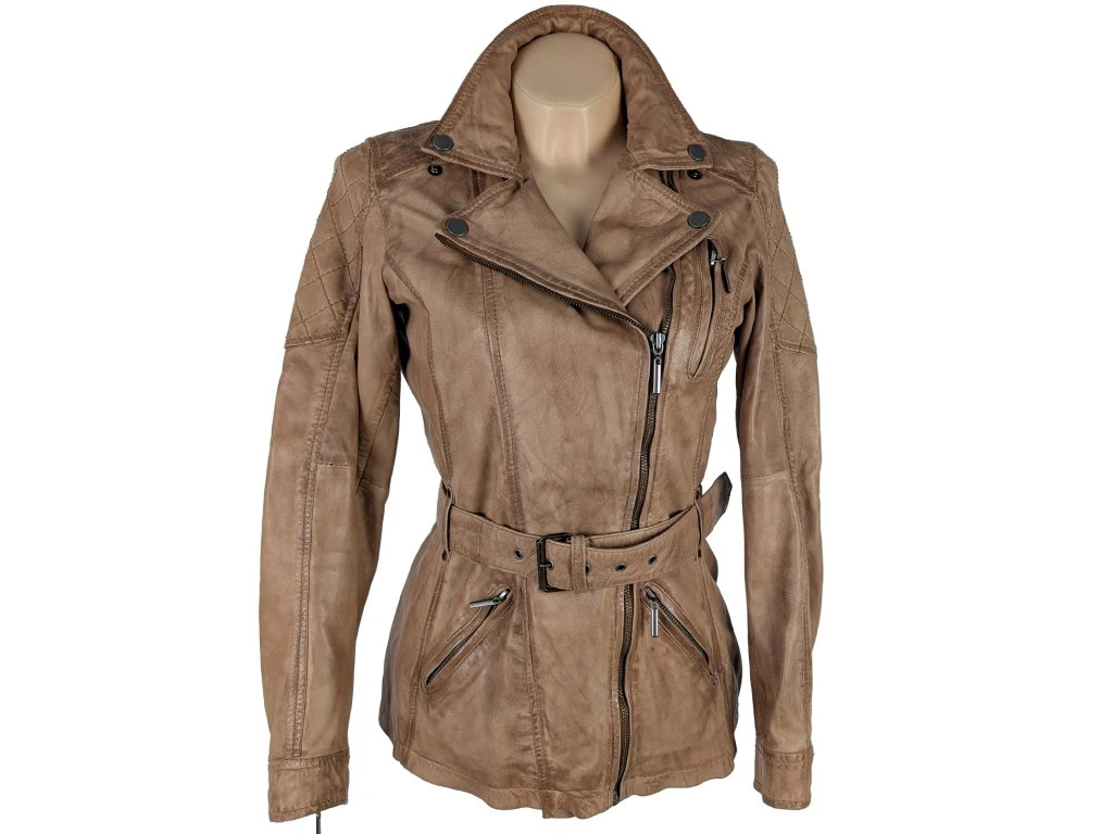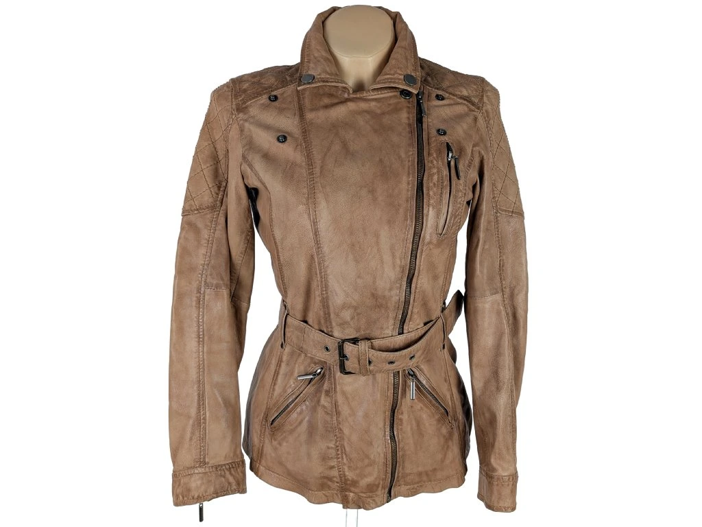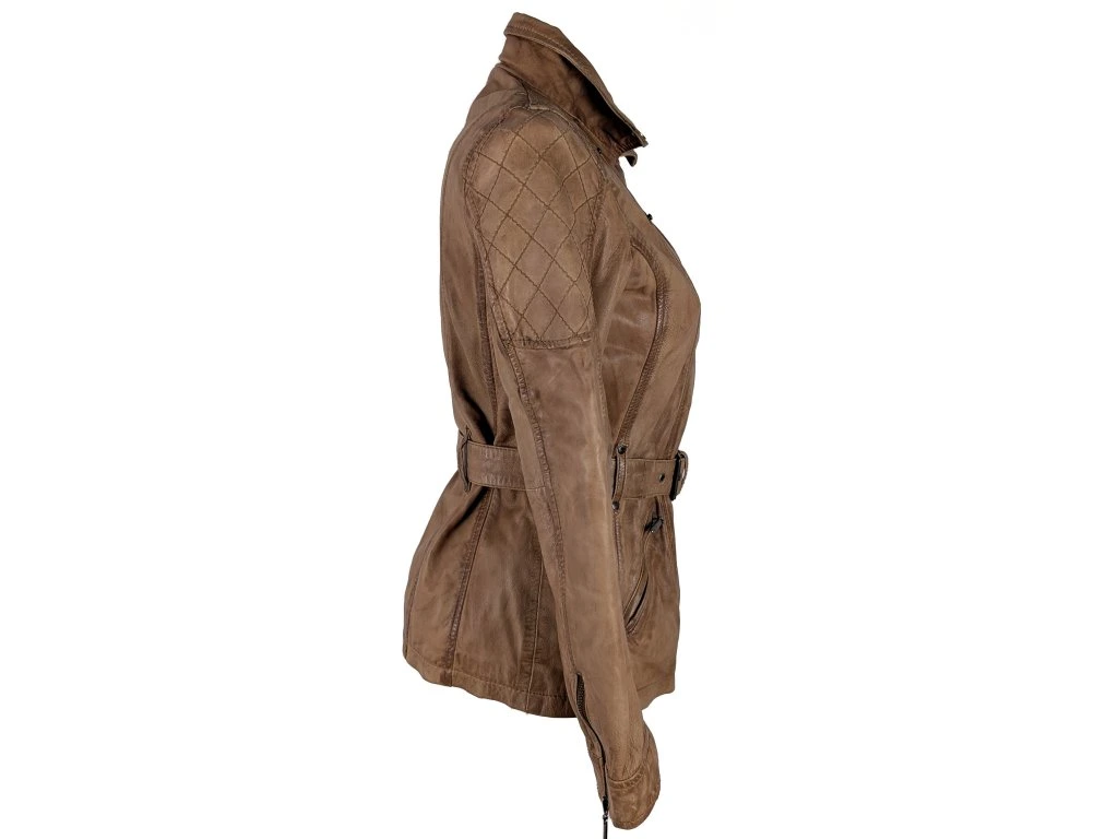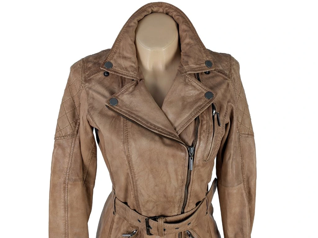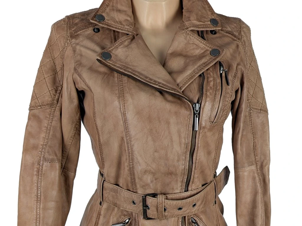KOŽENÝ dámský hnědý kabát - křivák s páskem KARA 38