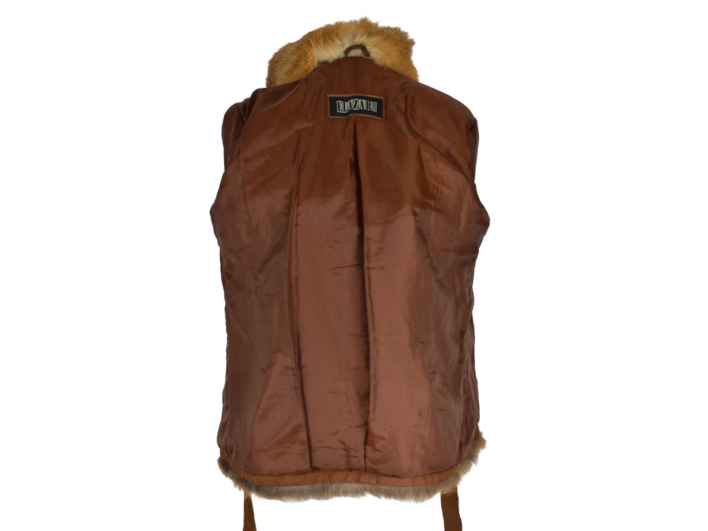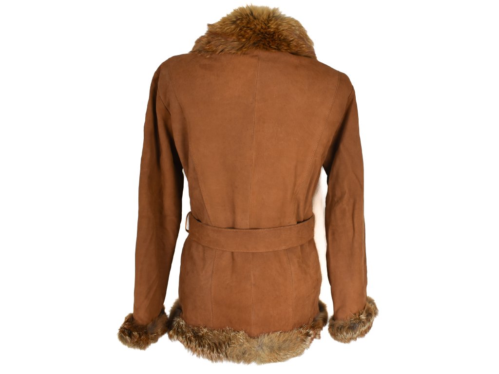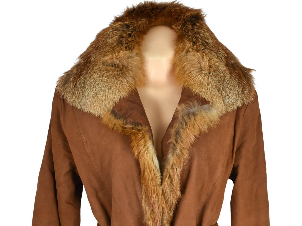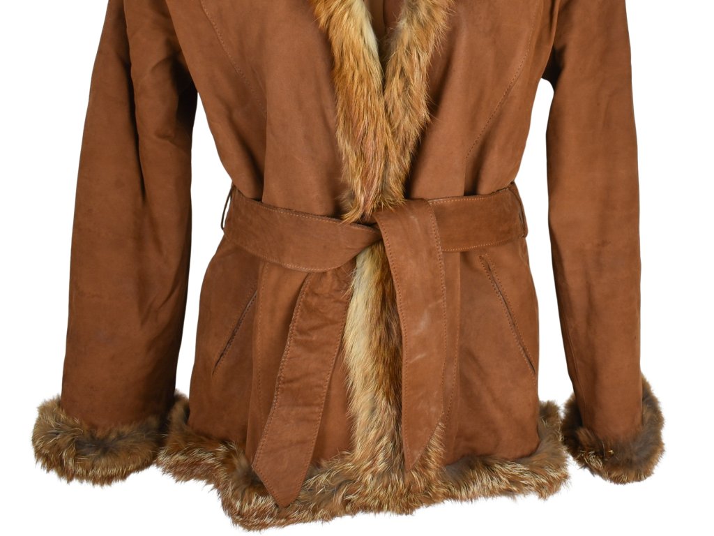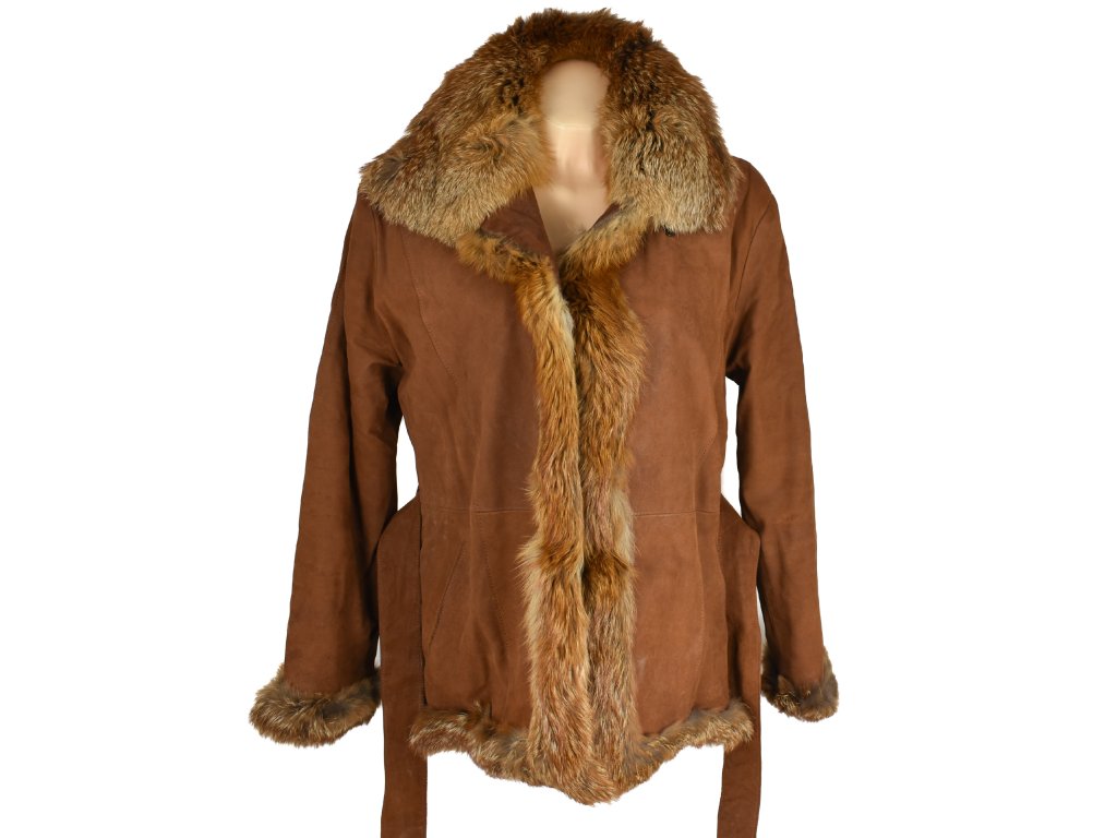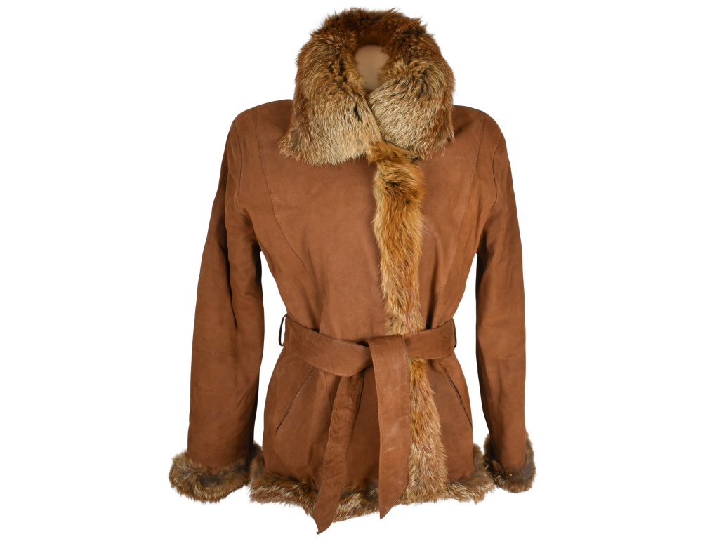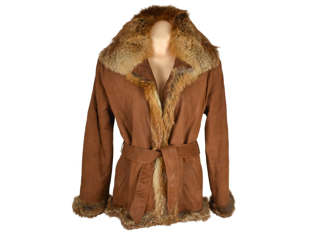 KOŽENÝ dámský hnědý kabát s páskem a pravou kožešinou M