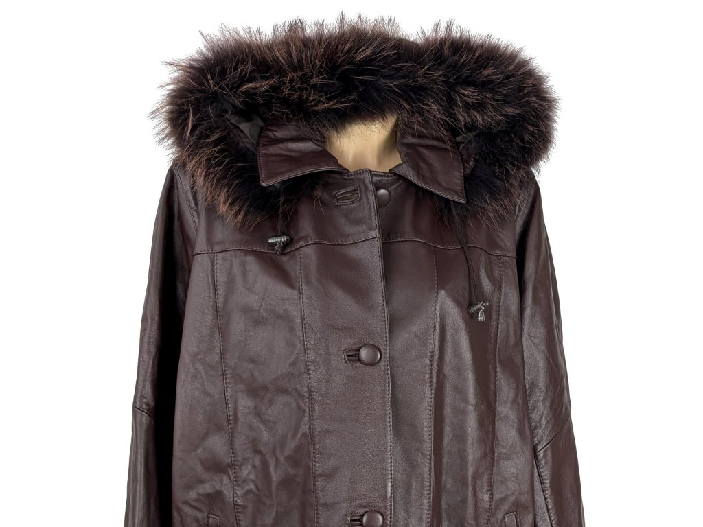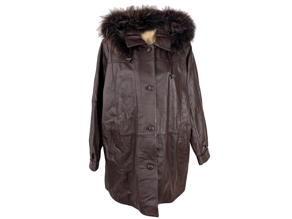 KOŽENÝ dámský kabát s kapucí s pravou kožešinou XXXL