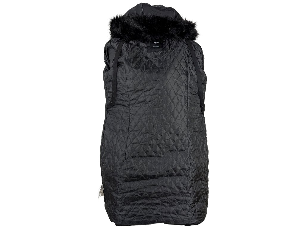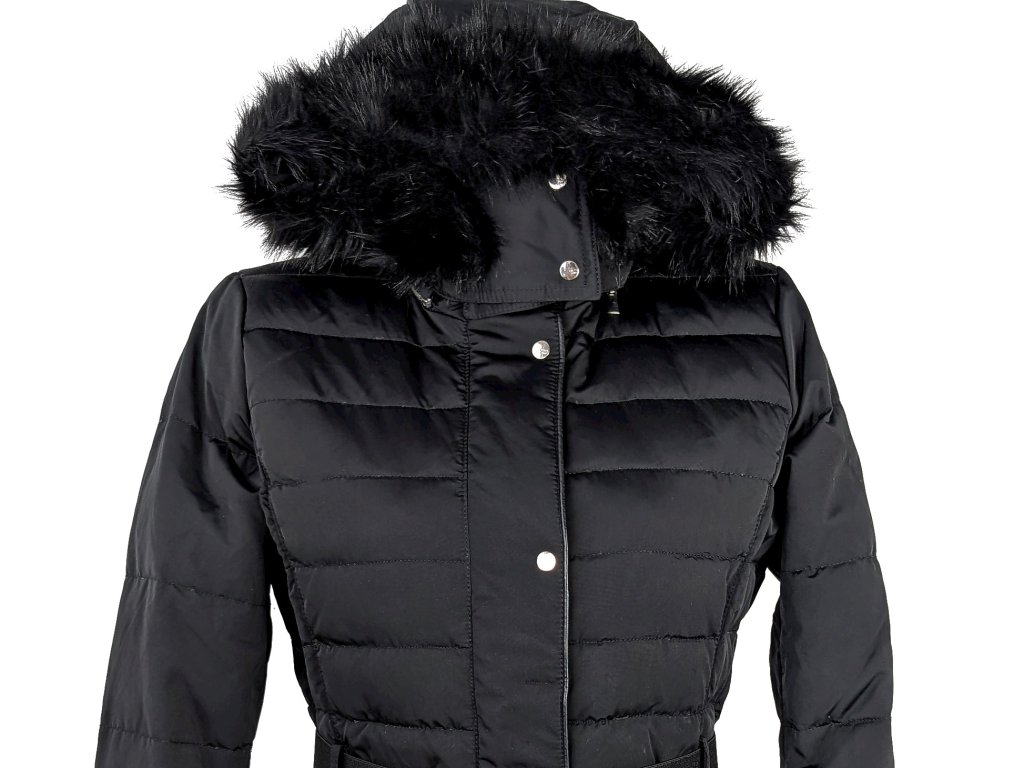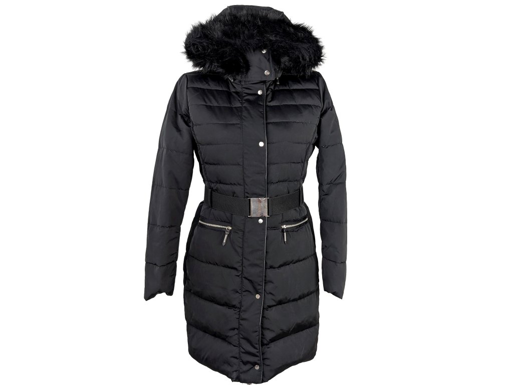Péřový dámský černý kabát s páskem a kapucí MANGO M