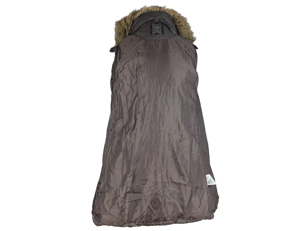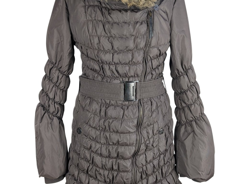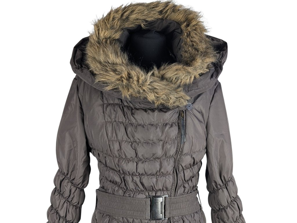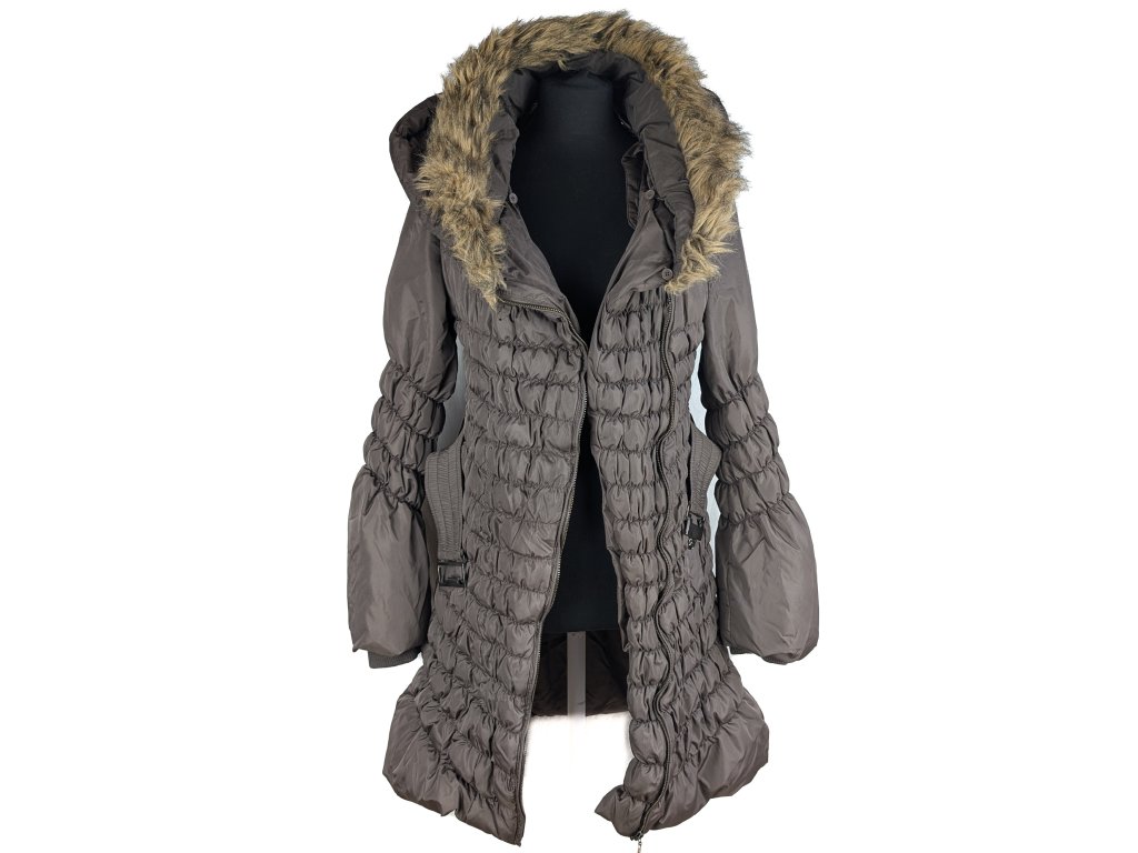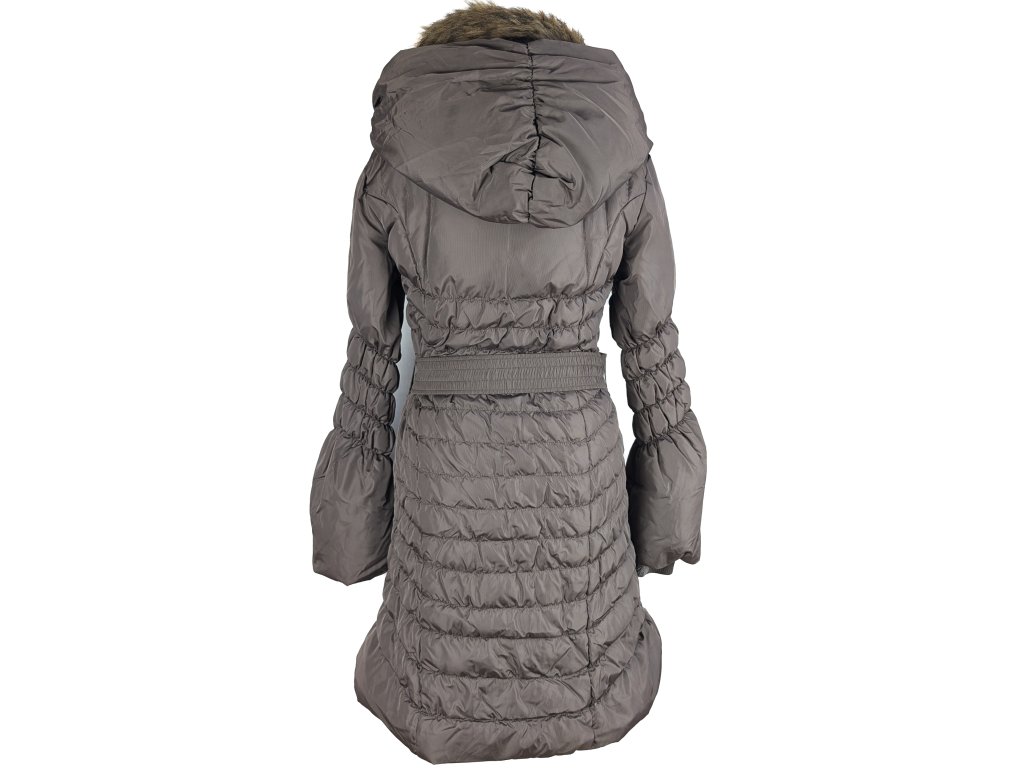 Péřový dámský hnědý kabát s páskem a kapucí Sublevel M