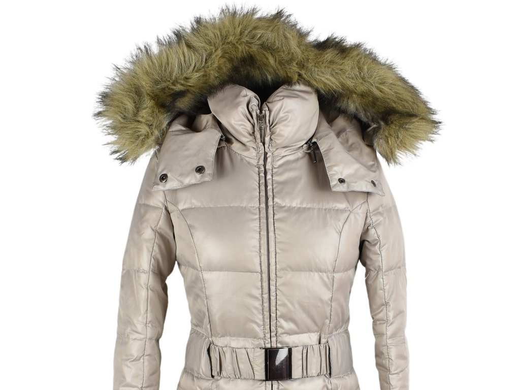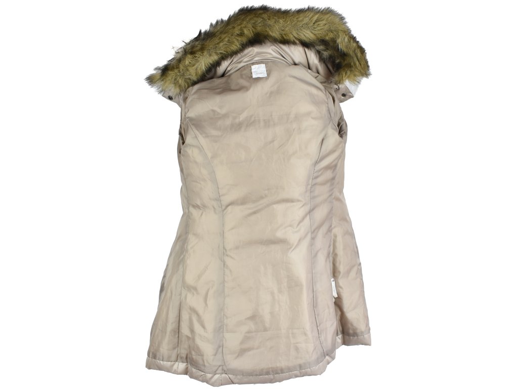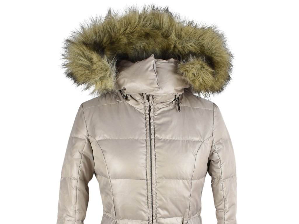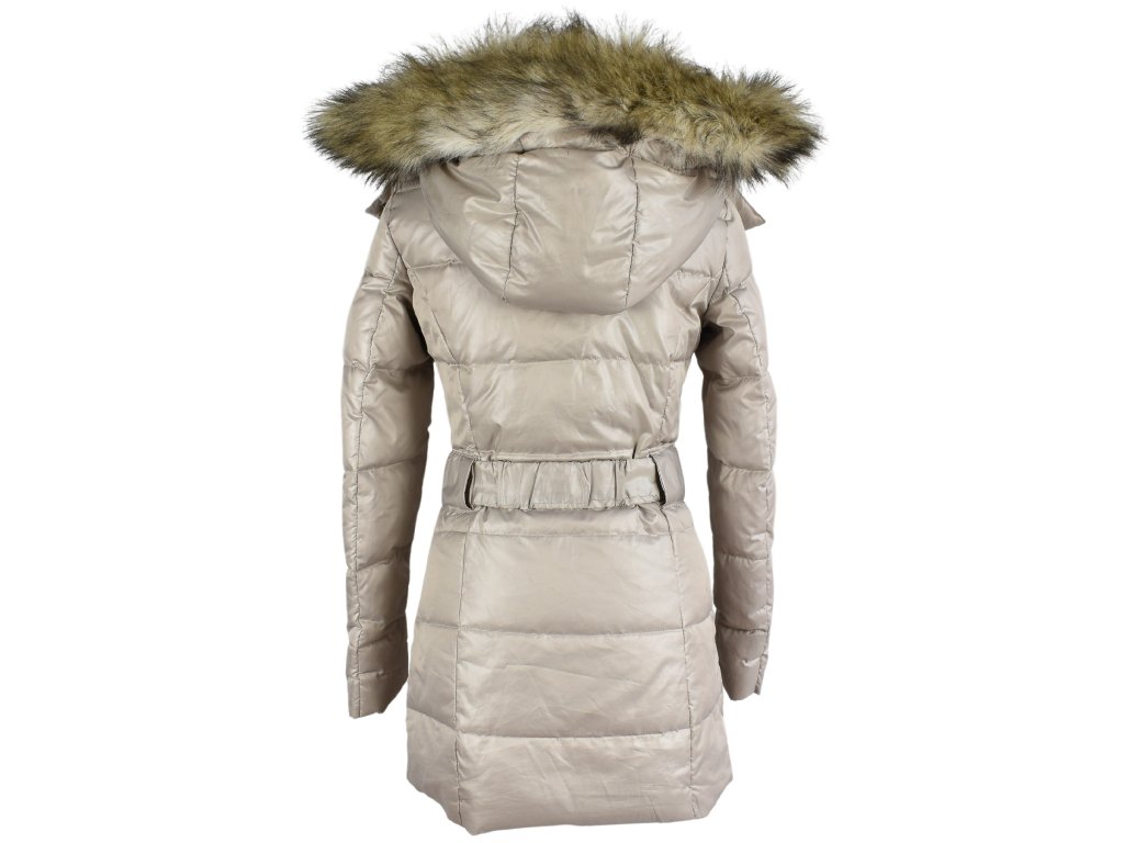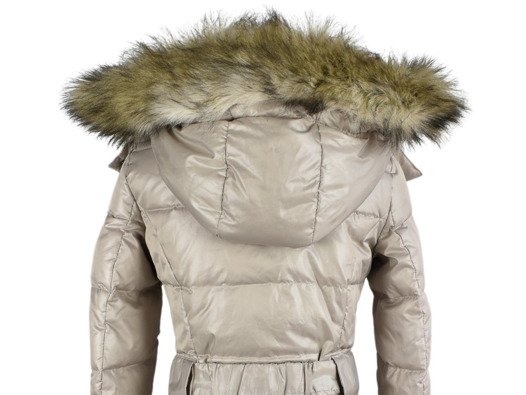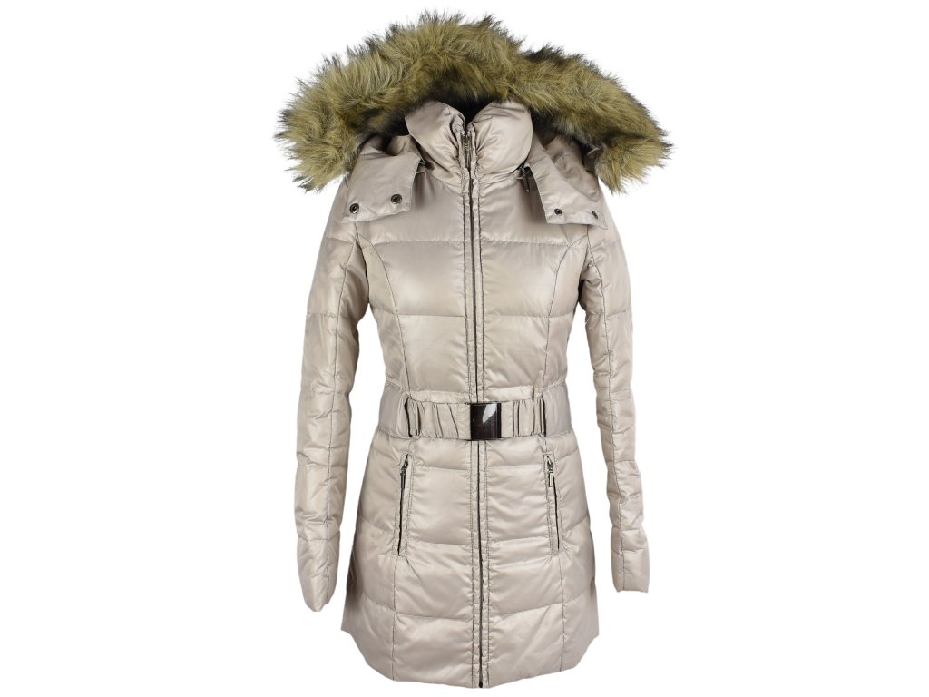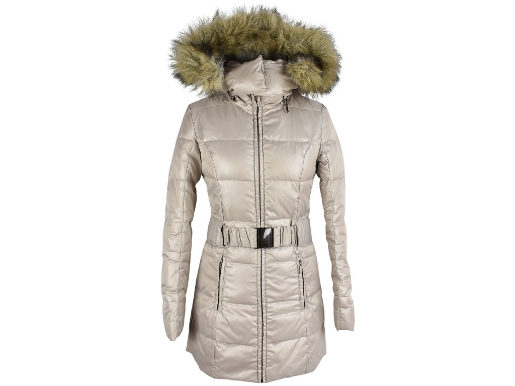 Péřový dámský krémový kabát s páskem a kapucí Camaieu 36, odnimatelná kapuce s odnimatelnnou kožešinou