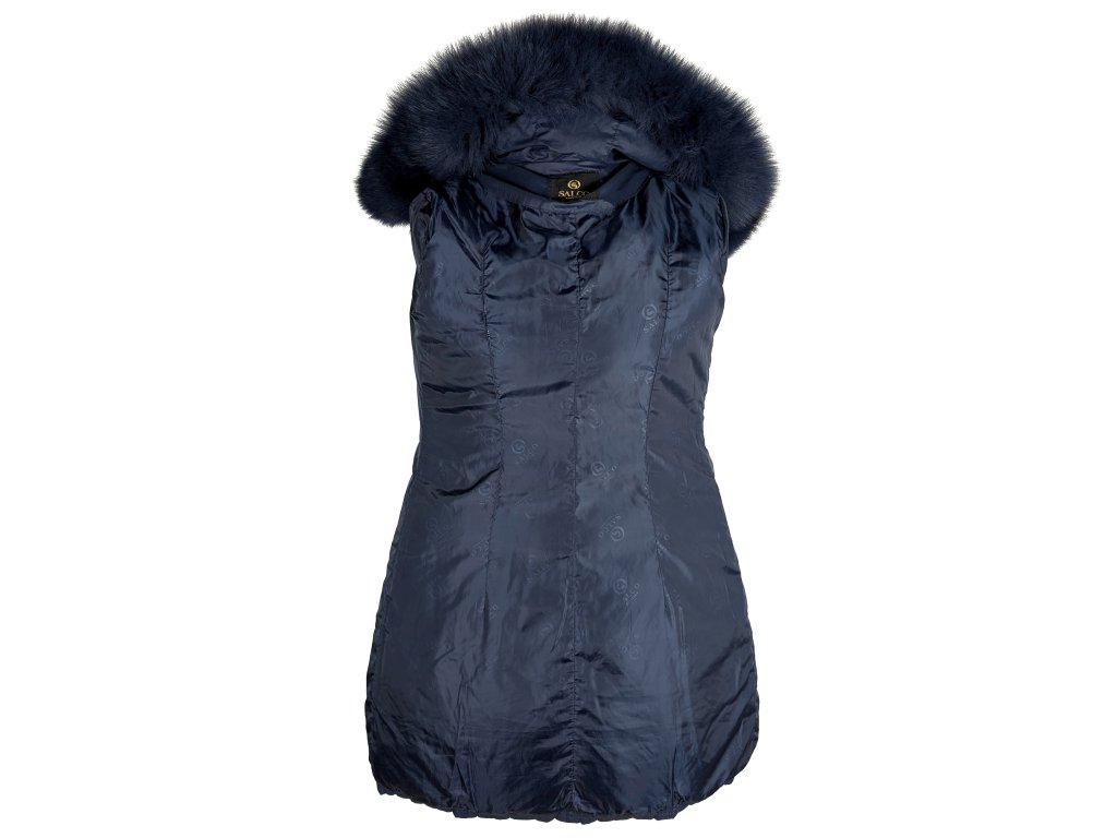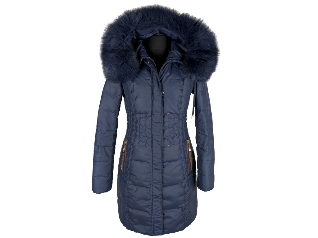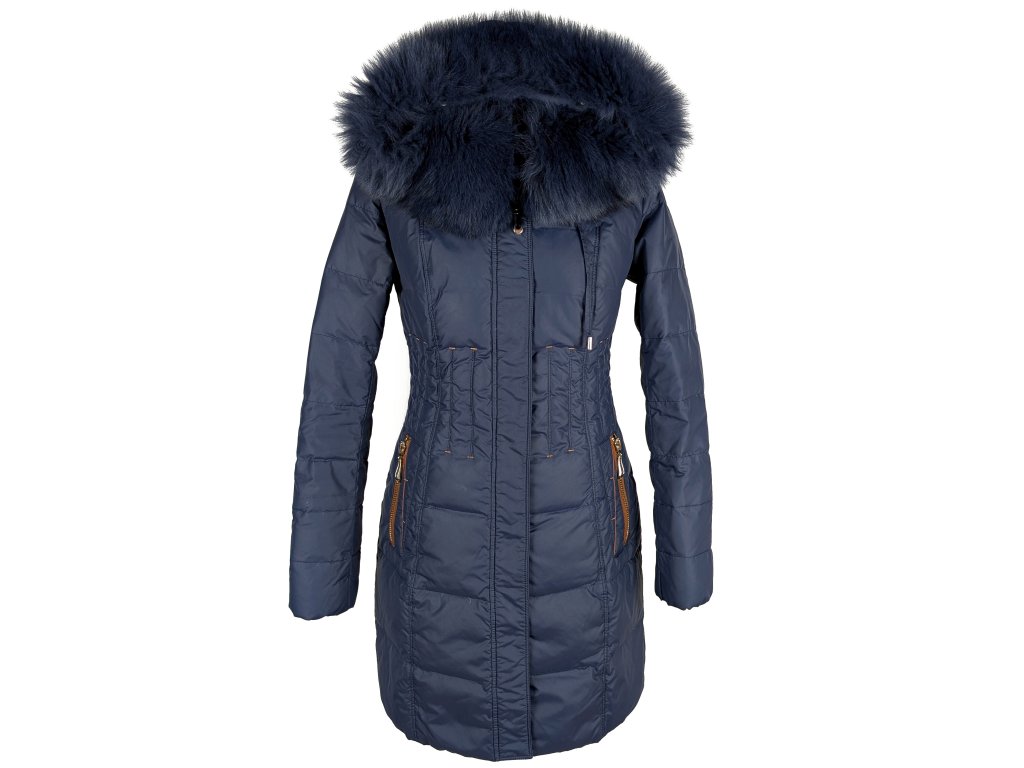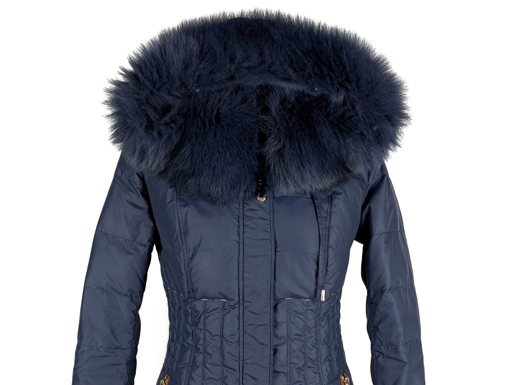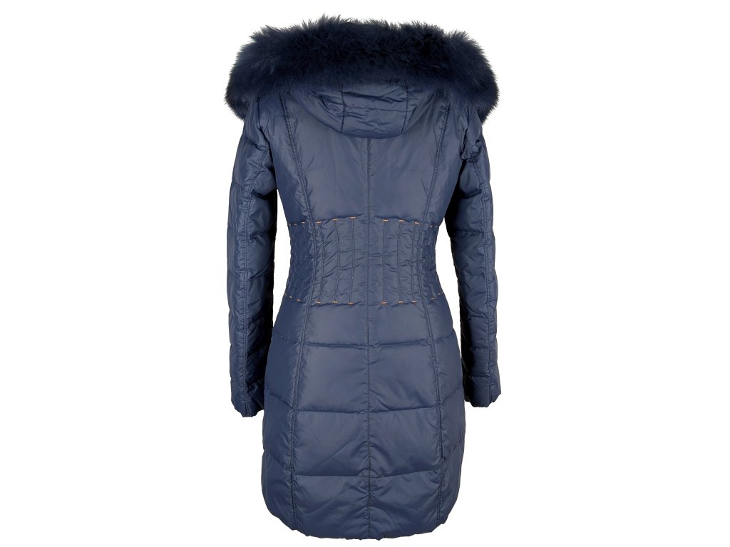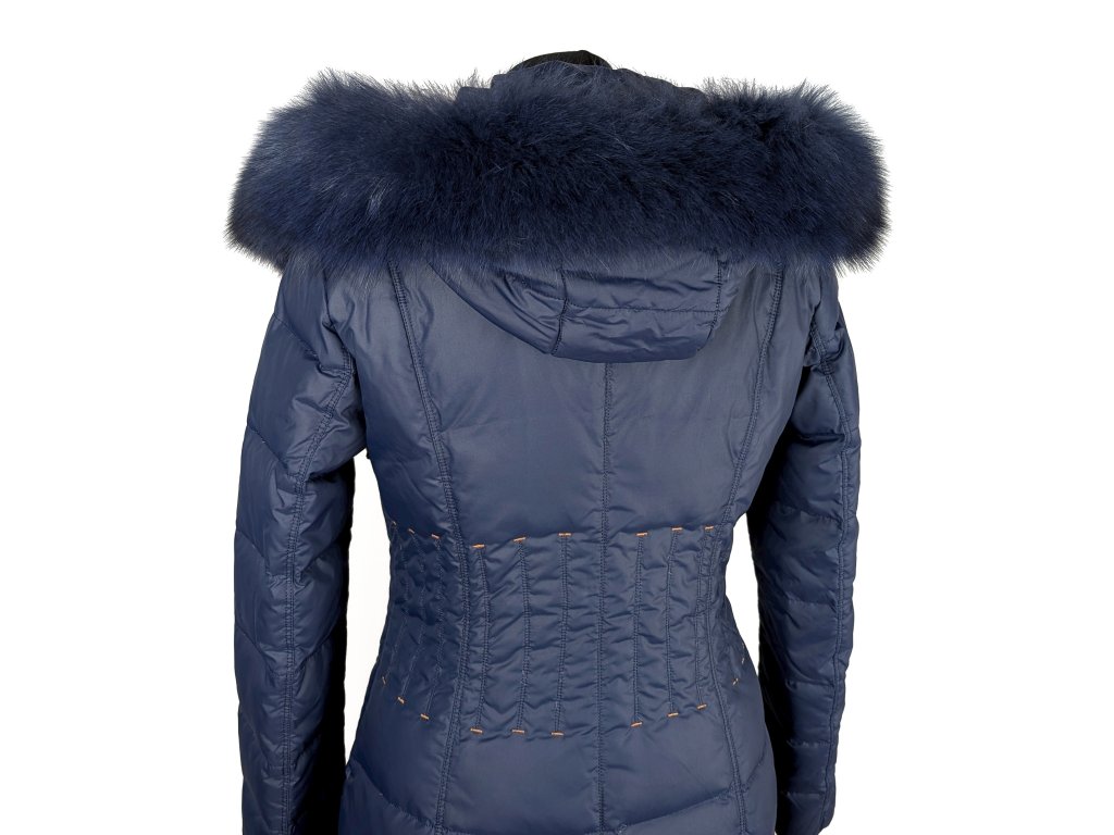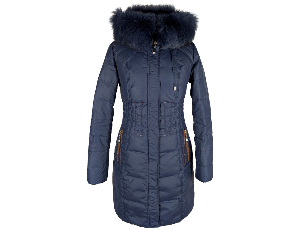 Péřový dámský modrý prošívaný kabát s kapucí s pravou kožešinou Salco XS
