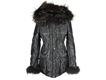Dámský stříbrný prošívaný kabát s kapucí s pravou kožešinou Leder Pellicce S 100% polyester, kapuce napevno, odnimatelná pravá kožešina na kapuci i na rukávech Prsa: 50 cm...