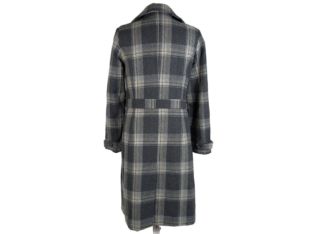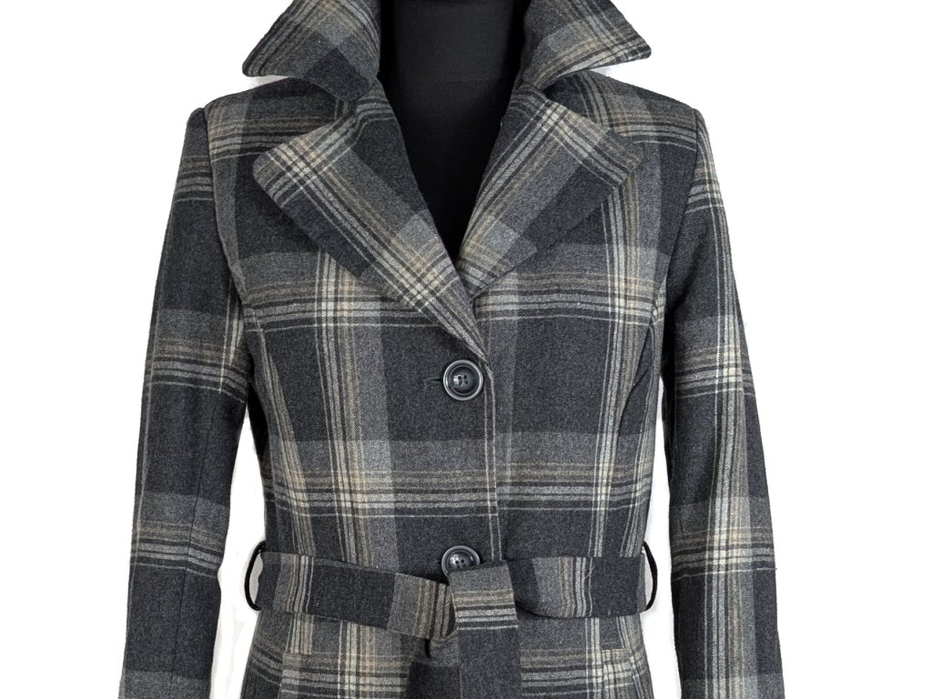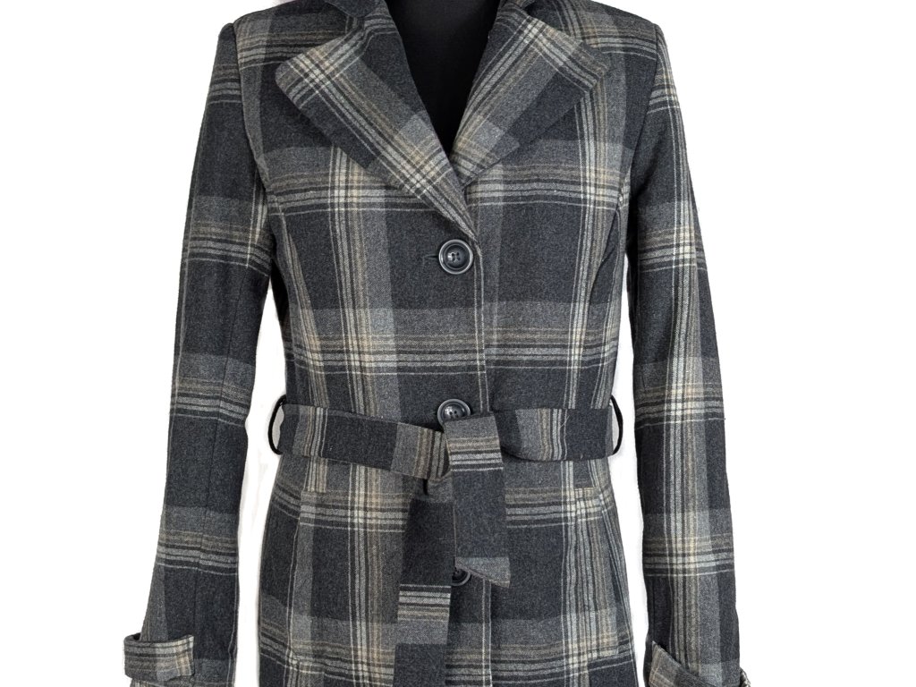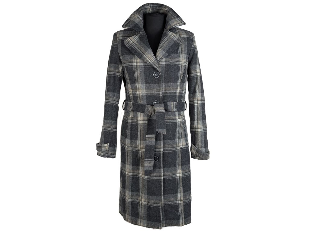 Vlněný (50%) dámský šedý zimní kostkovaný kabát s páskem Orsay 36