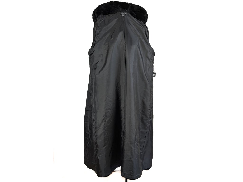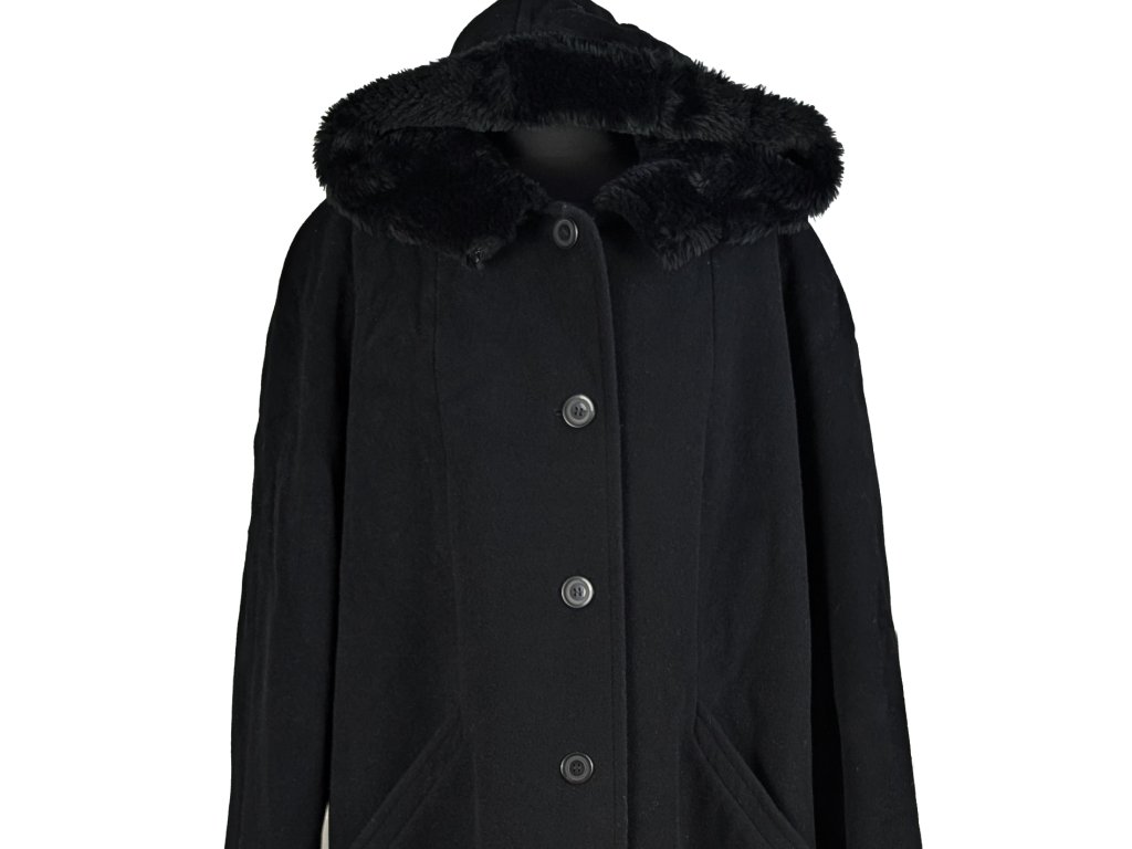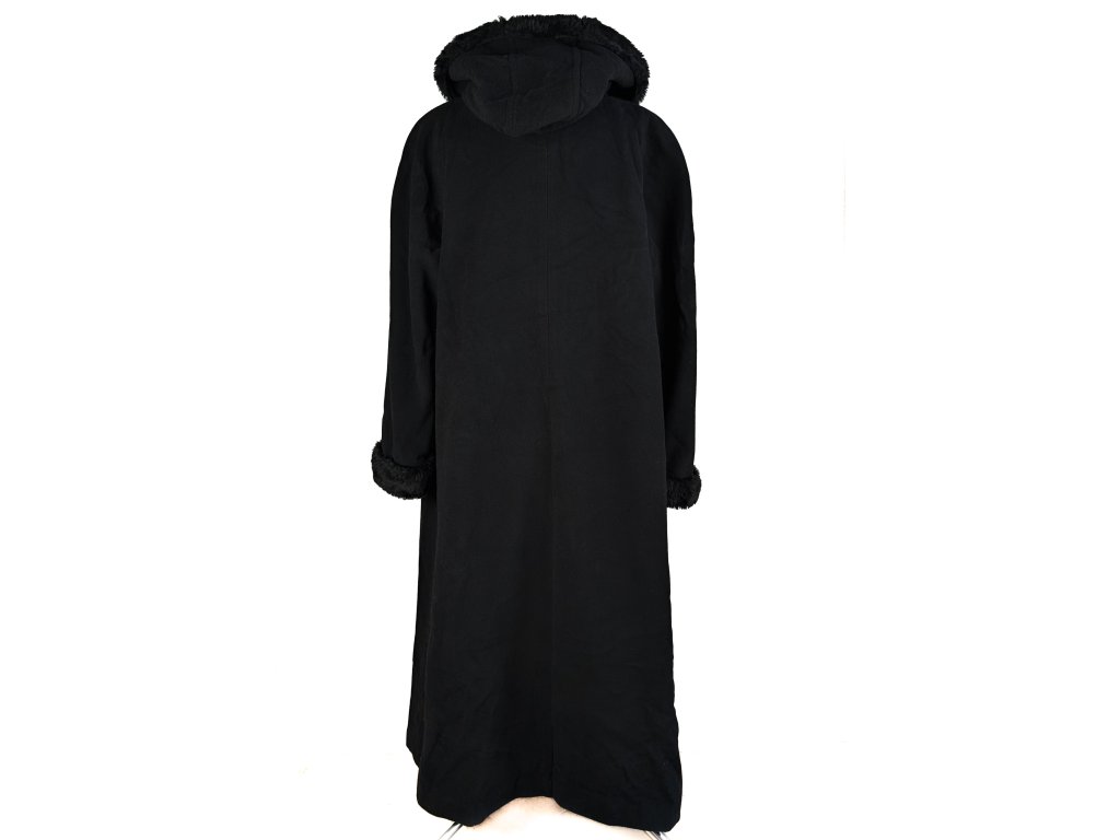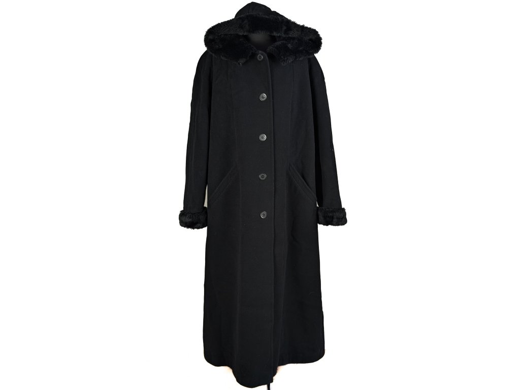 Vlněný (70%) dámský černý zimní dlouhý kabát s kapucí 46