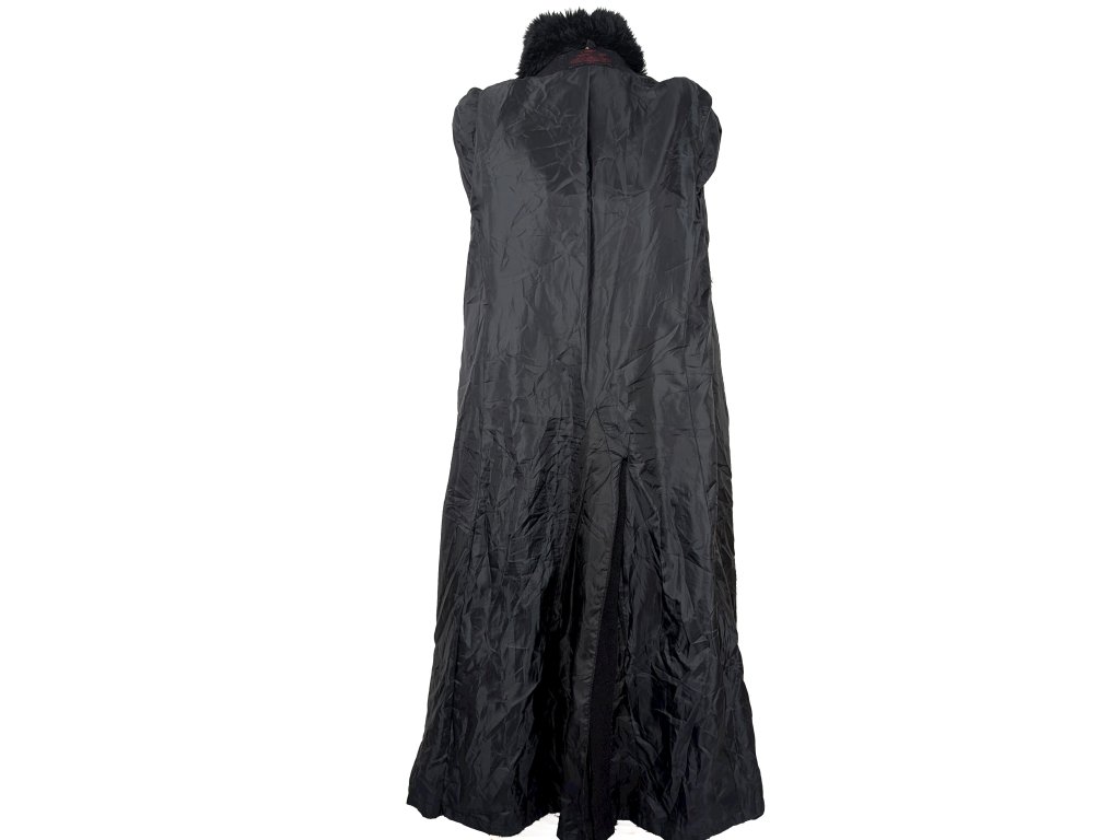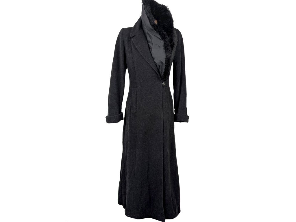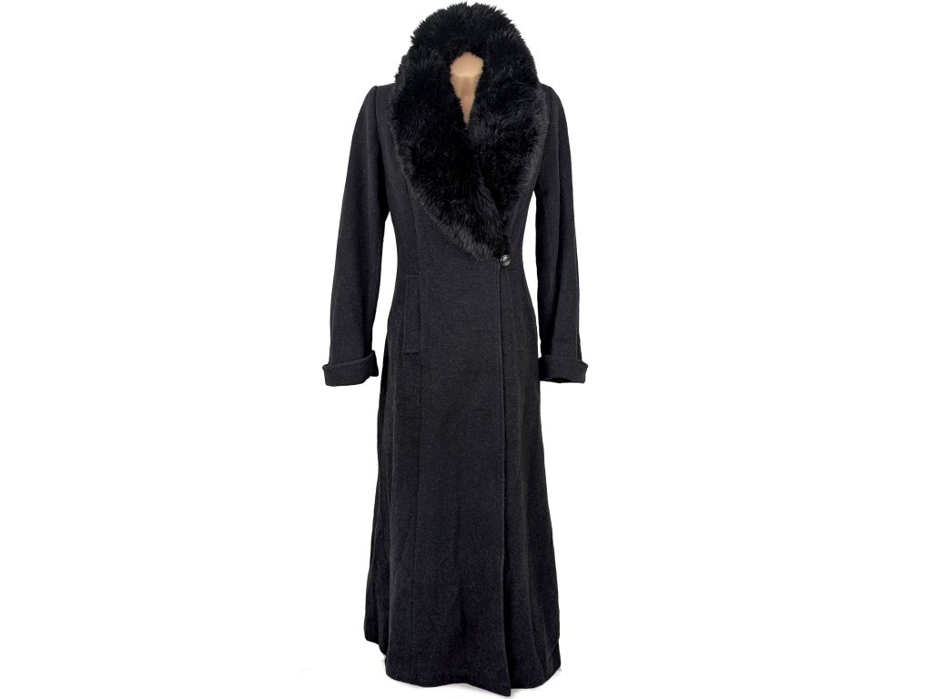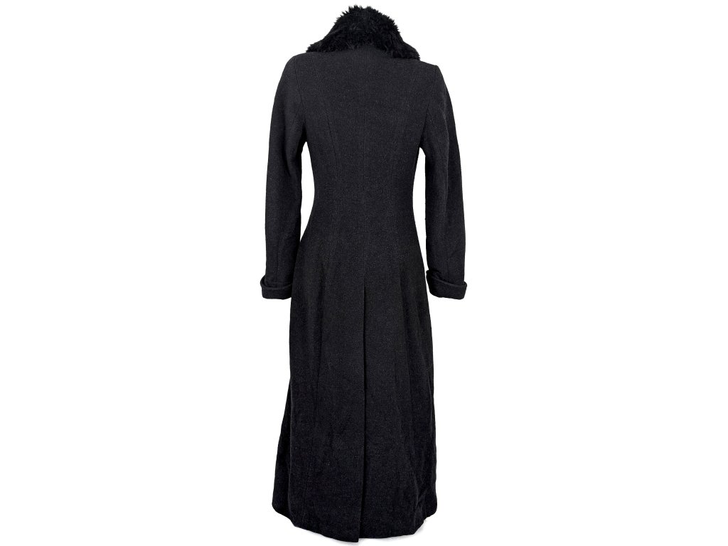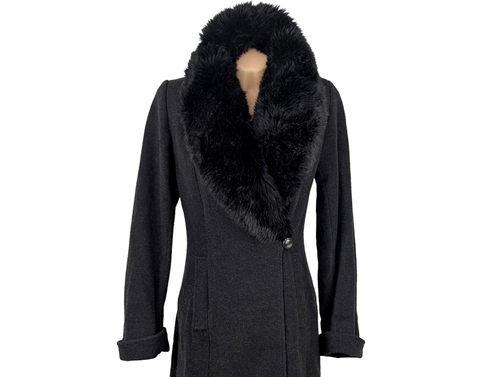 Vlněný (70%) dámský dlouhý šedočerný kabát s kožešinou (vlna, kašmír) M