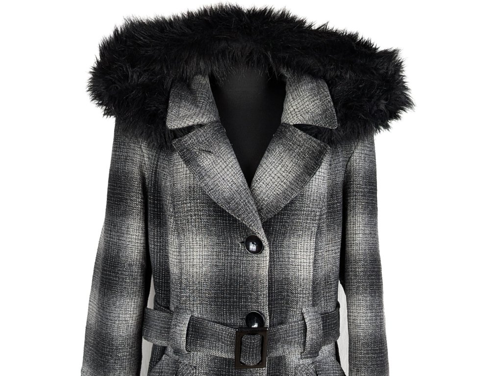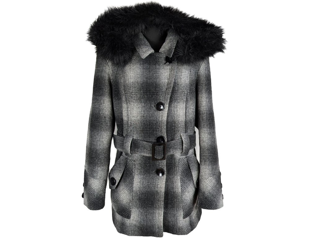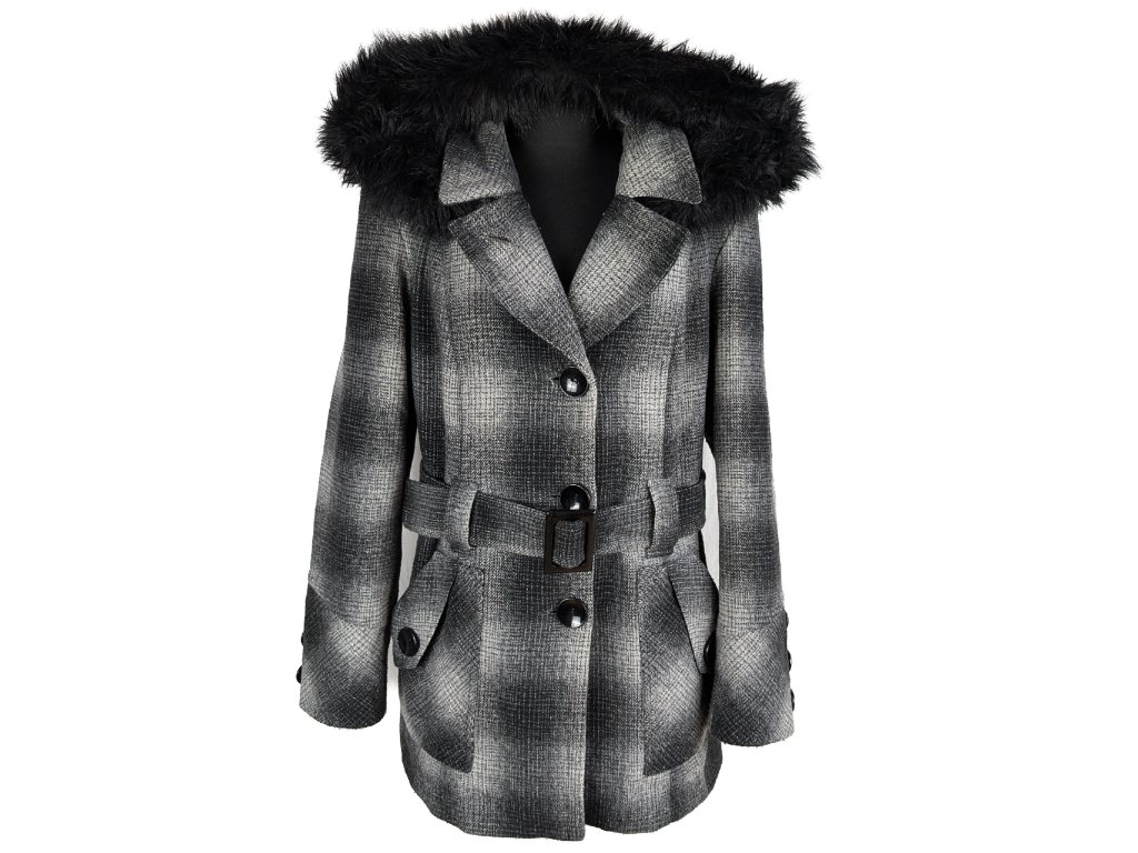 Vlněný (70%) dámský šedočerný zimní kabát s páskem a kapucí Makryl (vlna, kašmír) 38, 46