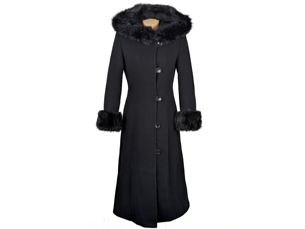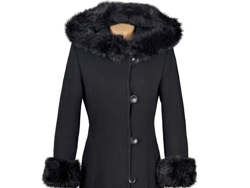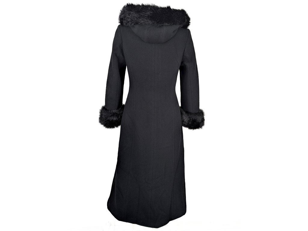 Vlněný (80%) dámský černý dlouhý kabát s kapucí Andmar S