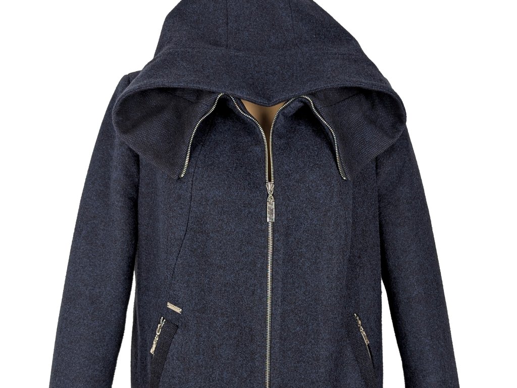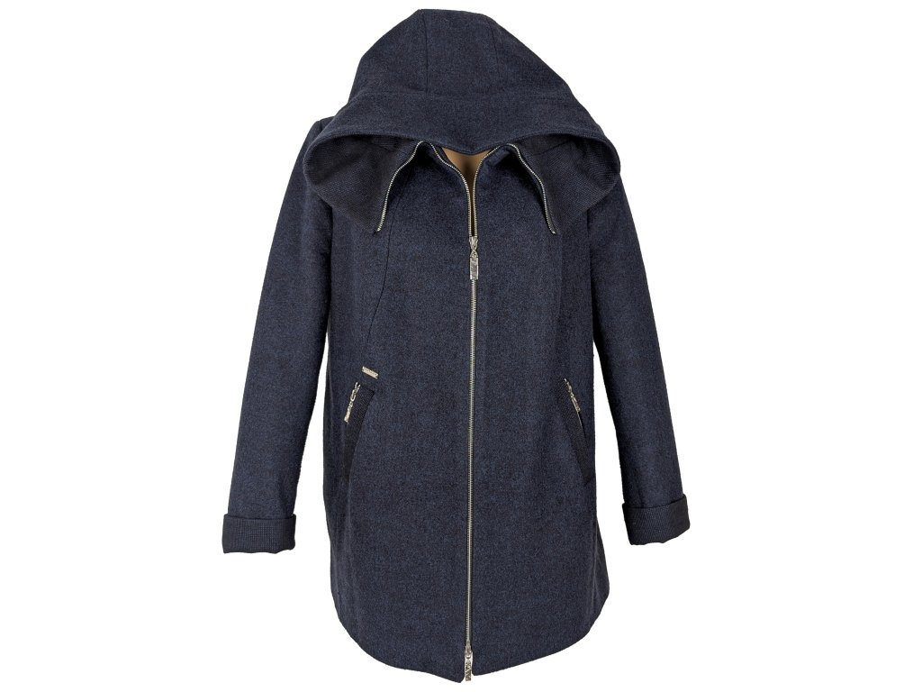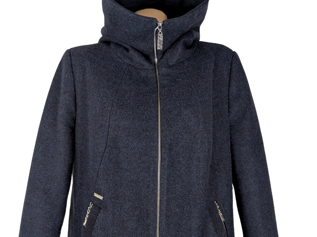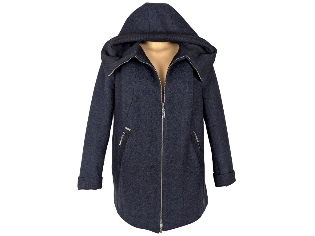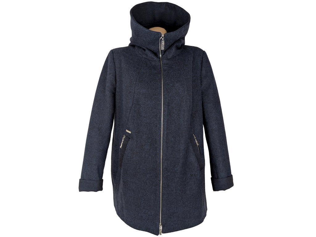 Vlněný (80%) dámský modrý zimní kabát na zip s kapucí Adriano Damianii 54